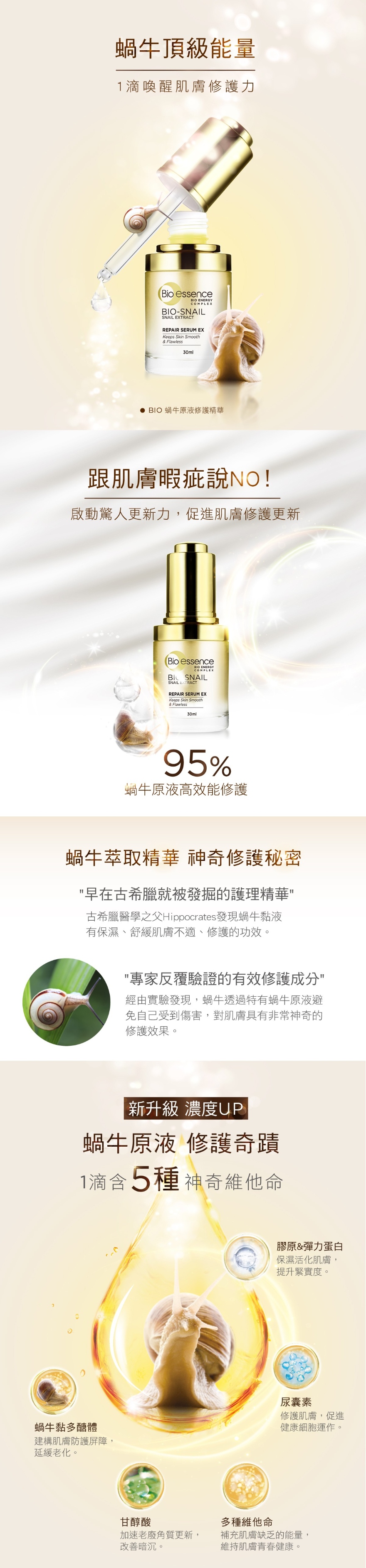 以蝸牛原液與銀耳多醣體,能有效增強肌膚修護力,並達到保濕、明亮、淡化肌膚瑕疵之功效。