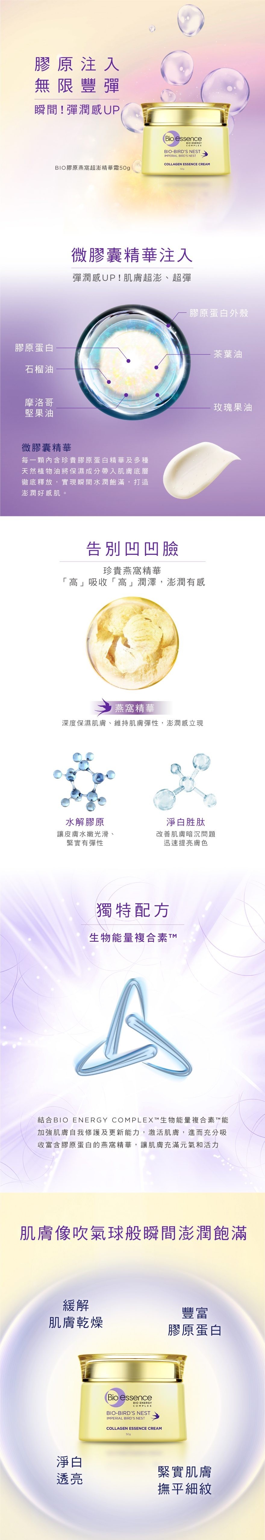 BIO膠原燕窩超澎精華霜添加珍貴燕窩萃取,配合微膠囊技術,有效保持養分於最新鮮之狀態,為肌膚長效注入源源不絕的水解膠原蛋白與玫瑰果油、摩洛哥堅果油等多種植萃精華油,達到深層滋潤功效,新鮮養分直達肌底,使肌膚澎潤有彈性;再輔以能量煥白胜肽,同時改善暗沉,膚色更顯白皙明亮。