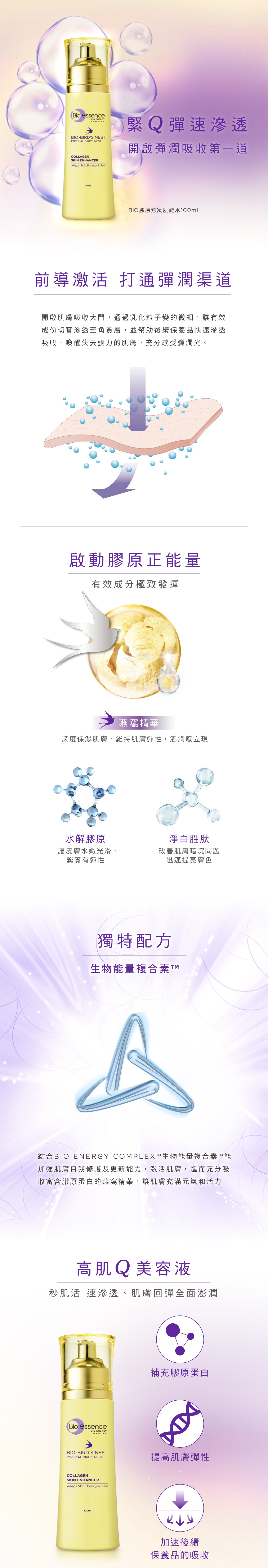 BIO膠原燕窩肌能水添加珍貴燕窩精華、能量煥白胜肽與水解膠原,超越一般化妝水功效,提高肌底對保養品的吸收力,極致保濕,從肌底開始調理,有效提升肌膚防禦力,同時均勻膚色,更促進肌膚吸收後續保養品,重現澎潤年輕白滑肌。
