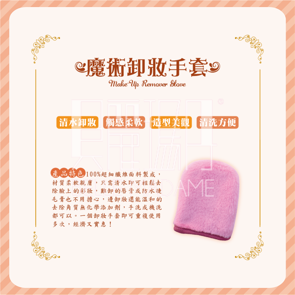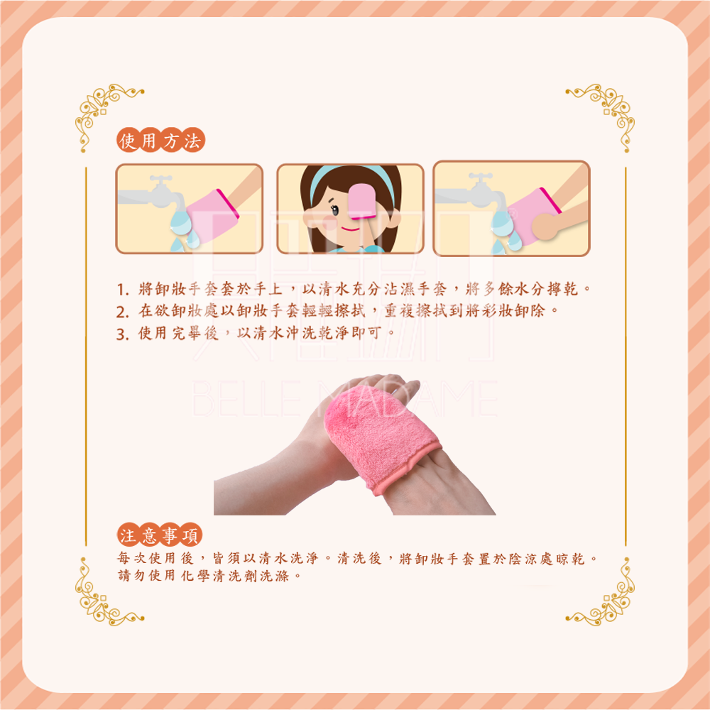 • 清水卸妝| 搭配清水即可帶走彩妝與髒污• 細緻柔軟纖維| 溫和清潔肌膚不刺激• 重複使用| 環保實用,清洗後即可再使用• 手套設計| 使用順手,清潔更方便• 輕巧實用| 居家或旅行皆適合