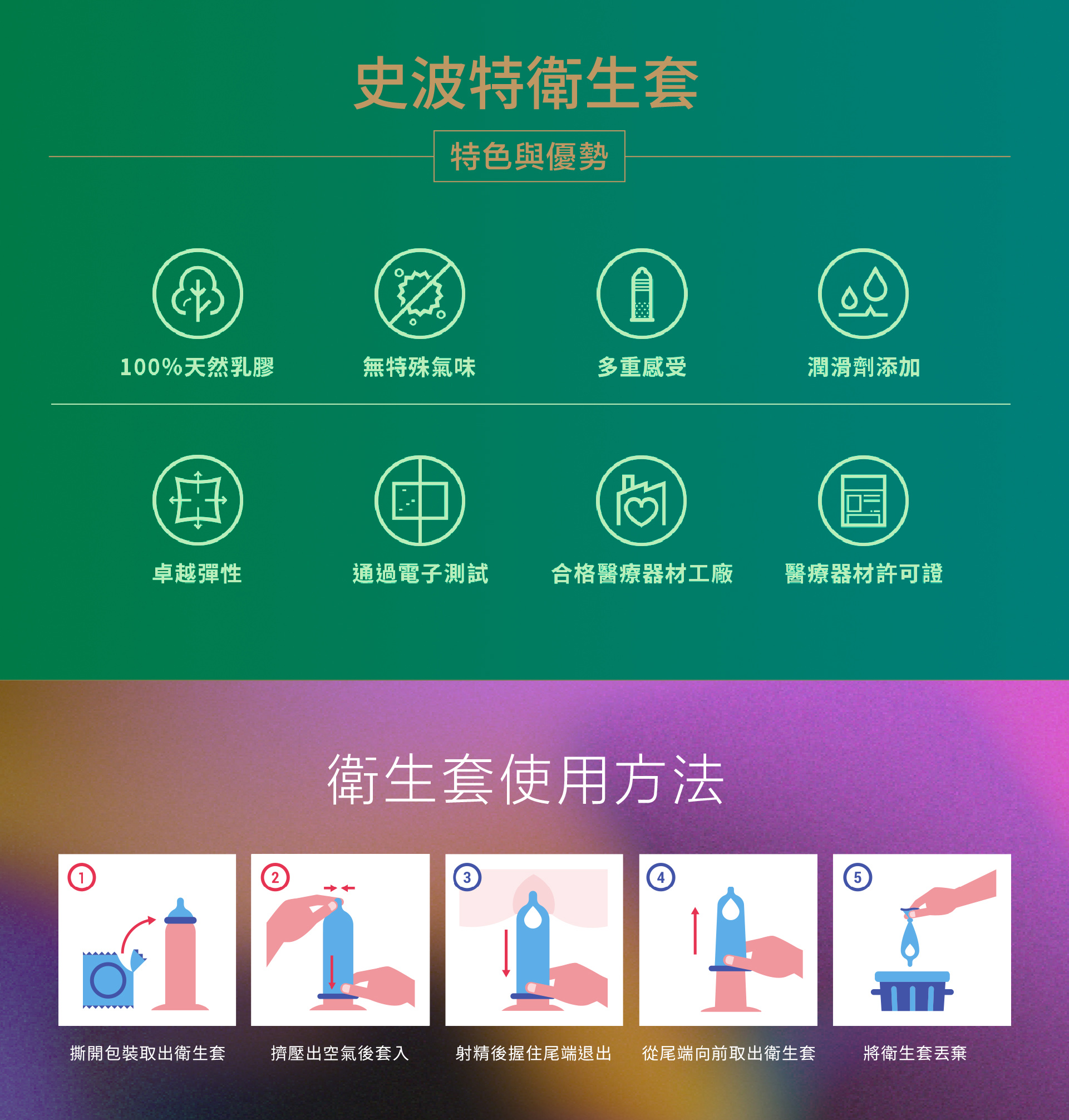 本產品為一次性用途,用完請丟棄勿再重複使用。本產品乃針對陰道性交設計,若使用於非陰道性交時,滑落或破損的機率會提高。目前任何一種保險套皆不能100%有效避孕及預防感染性病及愛滋病。本產品原料為天然橡膠製成之乳膠,對乳膠過敏者, 請避免使用。