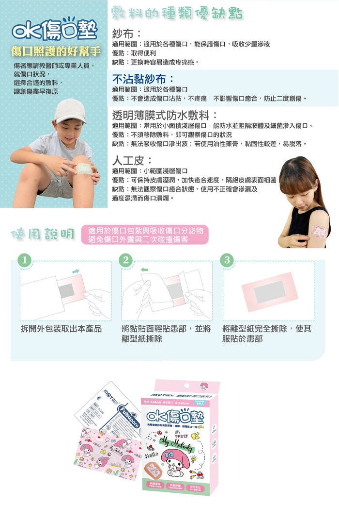 ◆免用傳統紗布塊及膠帶、繃帶,護理傷口一片OK!◆透氣舒適、延展性佳,採用醫療級低過敏膠種◆無痛撕換的不黏性傷口吸收墊,不易造成二次傷害◆安全衛生,單片GAMMA滅菌包裝入數:8片/盒尺寸:約5cm*8cm適合傷口:2.5cm*5cm材質:舒柔、針紮棉、不黏傷口薄膜產地:台灣產品資訊品名:摩貼舒 傷口敷料(滅菌)製造日期/批號:請詳見包裝標示有效期間:五年生產/製造商/委製商:華新橡膠工業股份有限公司田中廠電話:04-8752116地址:彰化縣田中鎮沙崙里中州路二段751號醫療器材許可證字號:衛署醫器製壹字第004922號-販售業者永豐耀有限公司台北市信義區松德路65號11樓之1電話:02-8791-2338統一編號:54648130消費者服務電話:02-8791-2337販賣業藥商許可執照:北市衛藥販(信)字第620117S356 號「消費者使用前應詳閱產品說明」西藥、醫療器材、含藥化粧品許可證查詢:衛生福利部食品藥物管理署(www.fda.gov.tw)\業務專區\藥品\資訊查詢\藥物許可證暨相關資料查詢作業\西藥、醫療器材、含藥化粧品許可證1、單片包裝若於開封前已破損,滅菌狀態即消失,請勿使用。2、禁止二次使用,請儲存於陰涼乾燥處,避免本產品變質。3、若出現紅腫、發癢等狀況,請立即停止使用。4、使用GAMMA照射滅菌,產品泛黃屬正常現象。5、產品示意圖之包裝插圖與實際產品略有差異,請依實際商品顏色為準。保存期限:依包裝所示製造日期:依包裝所示產品使用前說明「消費者使用前應詳閱產品說明書」販售業者名稱:合躍生活廣場事業股份有限公司業者地址:彰化市中正路一段253號2樓業者諮詢電話:04-7636339業者服務時間:周一至周五08:30〜17:00(國定例假日休)業者許可證明或登記證明:彰縣縣藥販字第6237017431號西藥、醫療器材、含藥化粧品許可證查詢:衛生福利部食品藥物管理署(www.fda.gov.tw)》業務專區(藥品\資訊查詢\藥物許可證曁相關資料查詢作業\西藥、醫療器材、含藥化粧品許可證中藥許可證查詢:衛生福利部中醫藥司(www.mohw.gov.tw/CHT/DOCMAP)\中藥藥品許可證查詢
