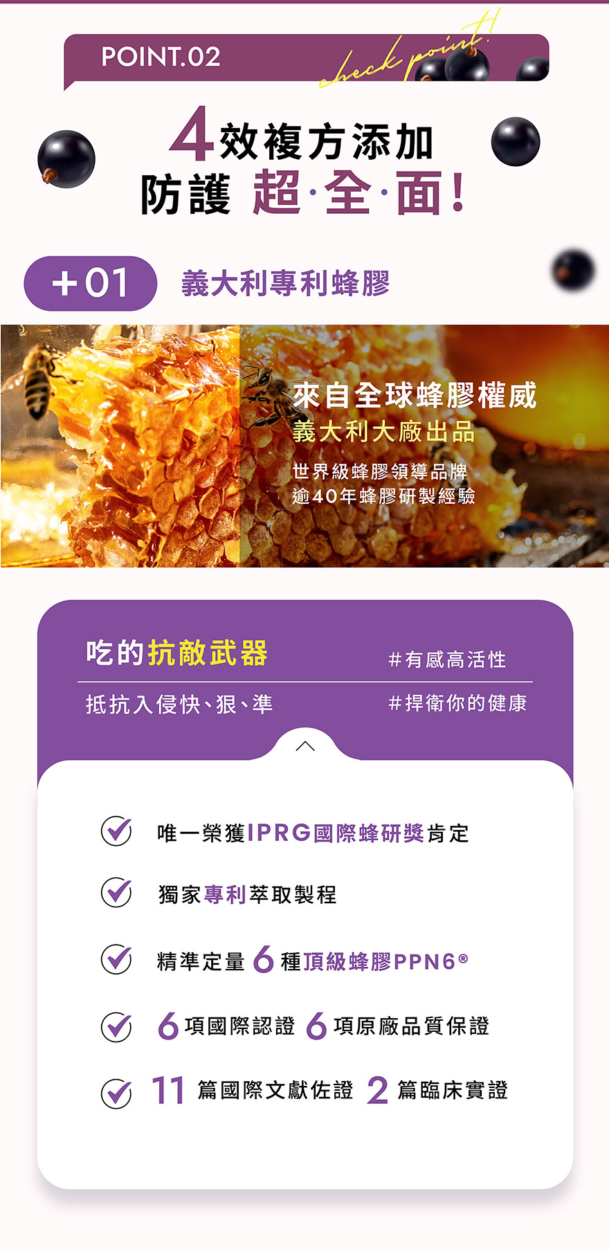 到處奔波,你的健康後援準備好了嗎?五大頂規配方:奧地利黑接骨木莓採用獨家IPT濾萃技術,保留高倍花青素、義大利專利蜂膠精準定量6種天然多酚複合物PPN6,全面守護呼吸、生薑萃取物160X薑辣素、卡曼橘C最天然的維生素補給、天然酵母鋅能量發電機來源,替你全面捍衛外敵。