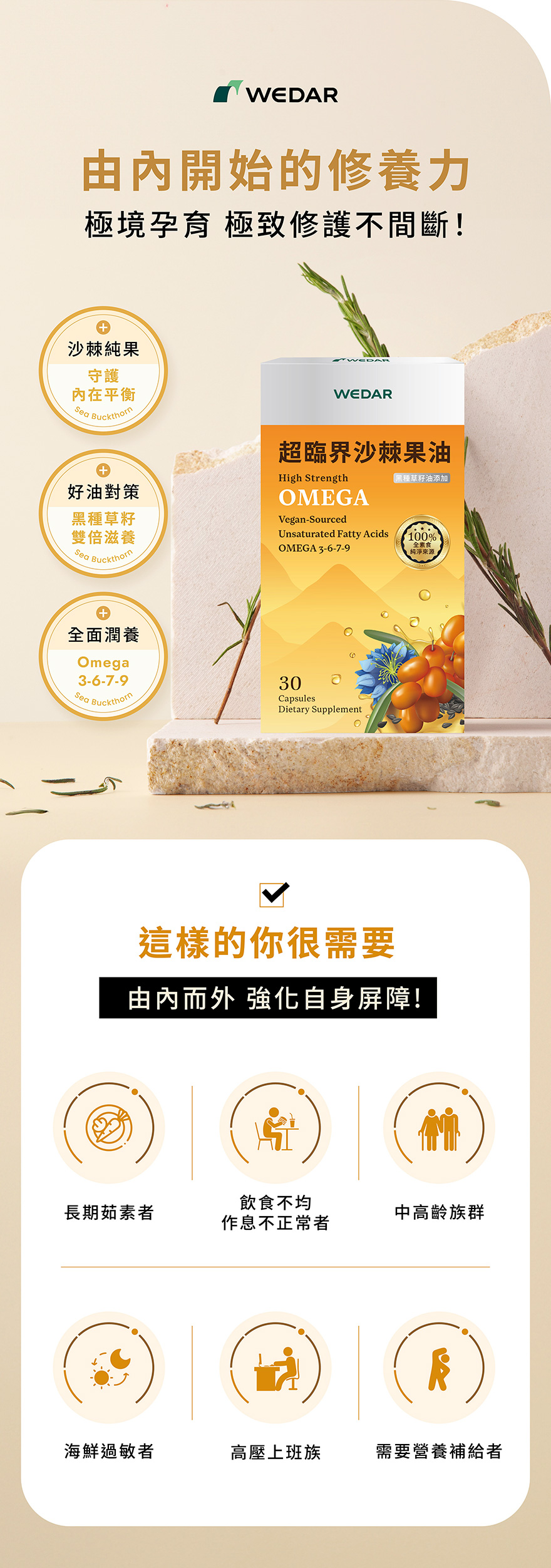 青藏高原有機沙棘純果+黑種草籽萃取,補充Omega 3-6-7-9、定量百里香醌全面守護,全素可食。