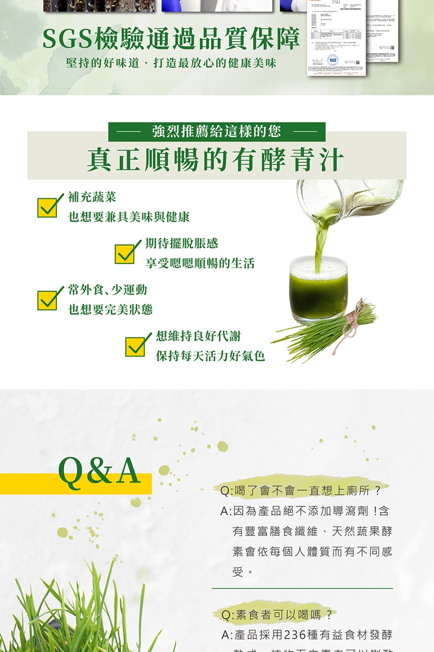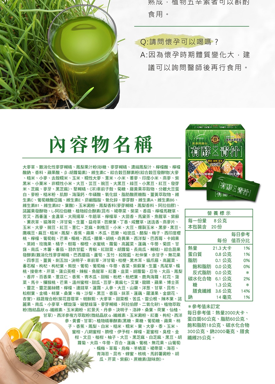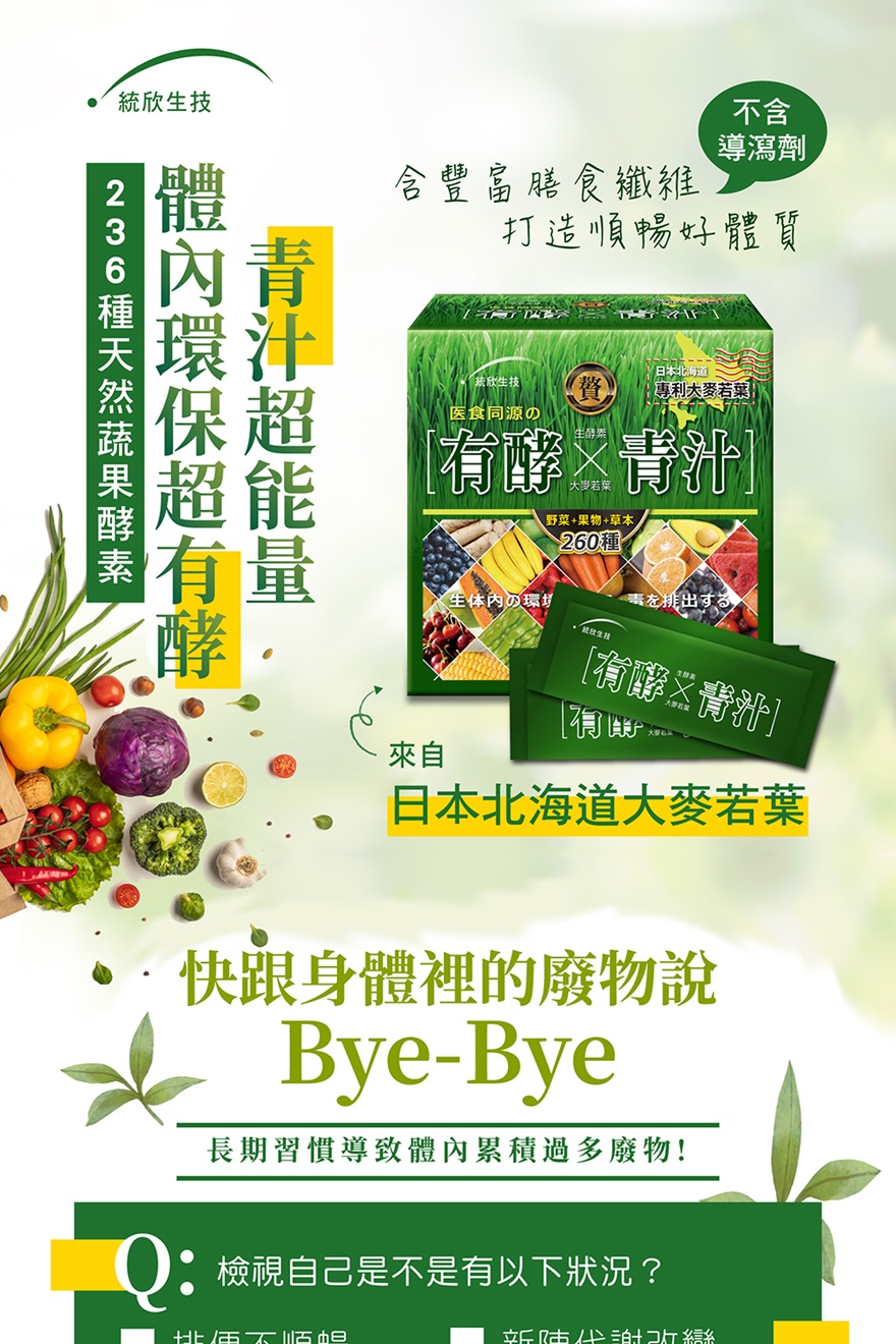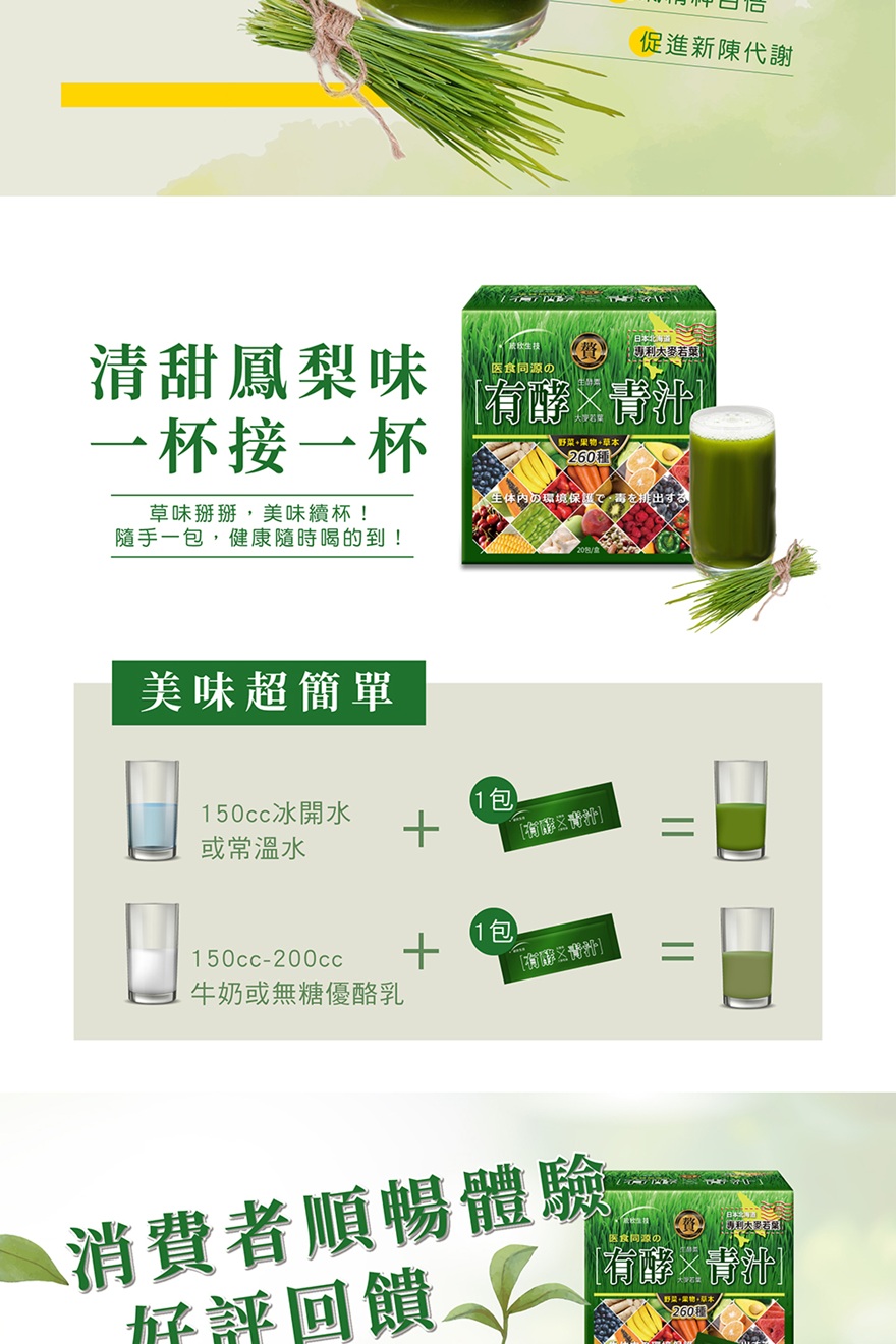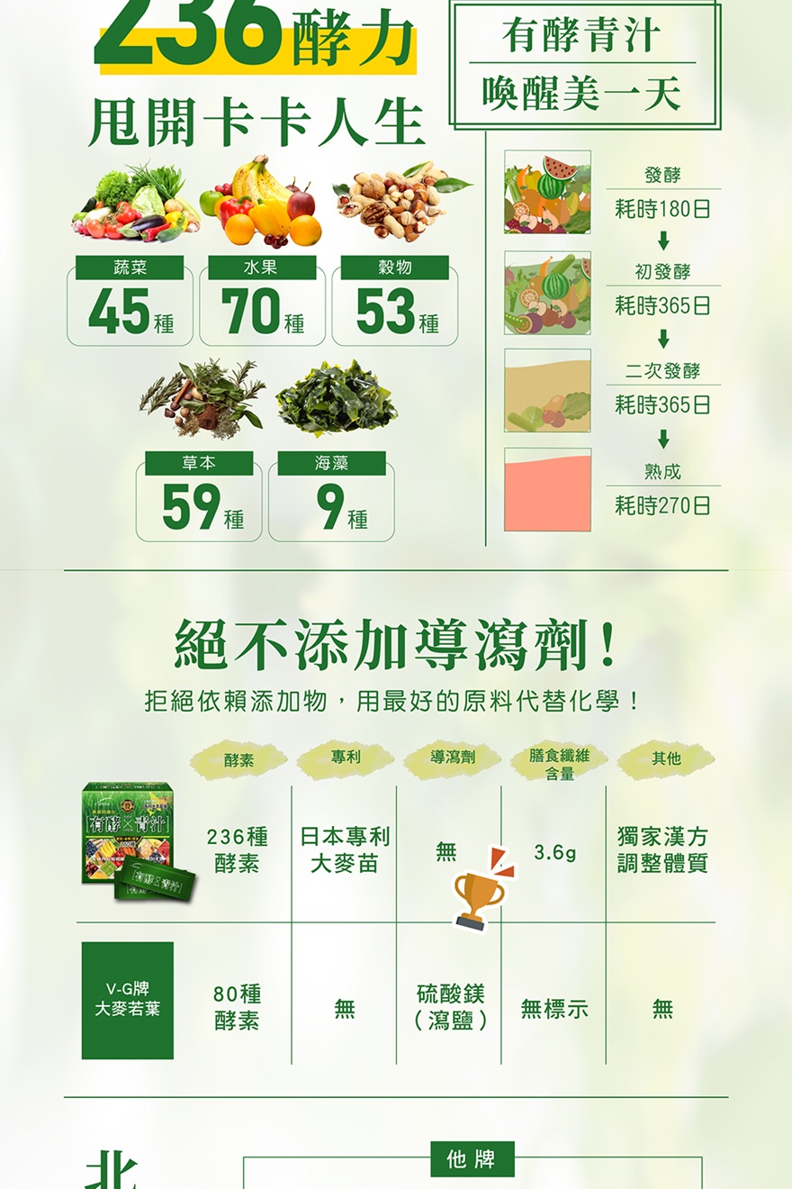 ●236種蔬果穀麥草本發酵 (蔬菜45+水果70+穀物53+草本59+海藻9),補充不足的營養素,有酵更順暢。