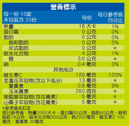.游離型葉黃素,分子小、達1.2倍以上利用率。.黑醋栗萃取物,具維生素C、E等多種營養素。.山桑子萃取,避免外在刺激提升舒適感。