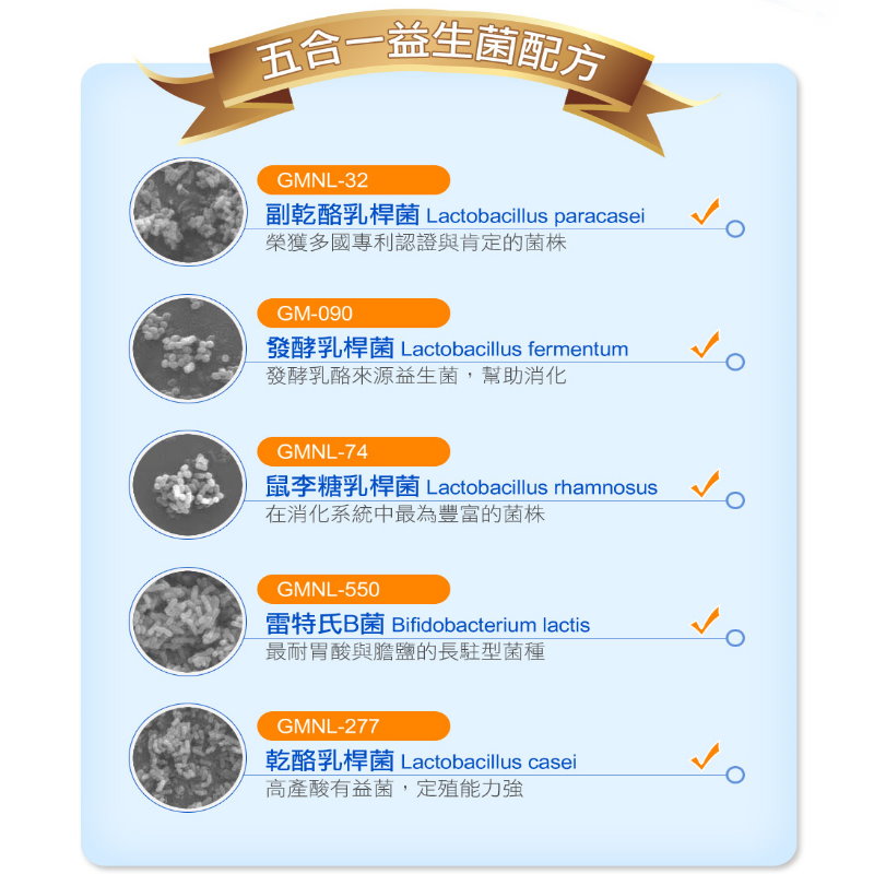 ✔五菌合一,含有美、日、中、台多國專利認證的菌株。