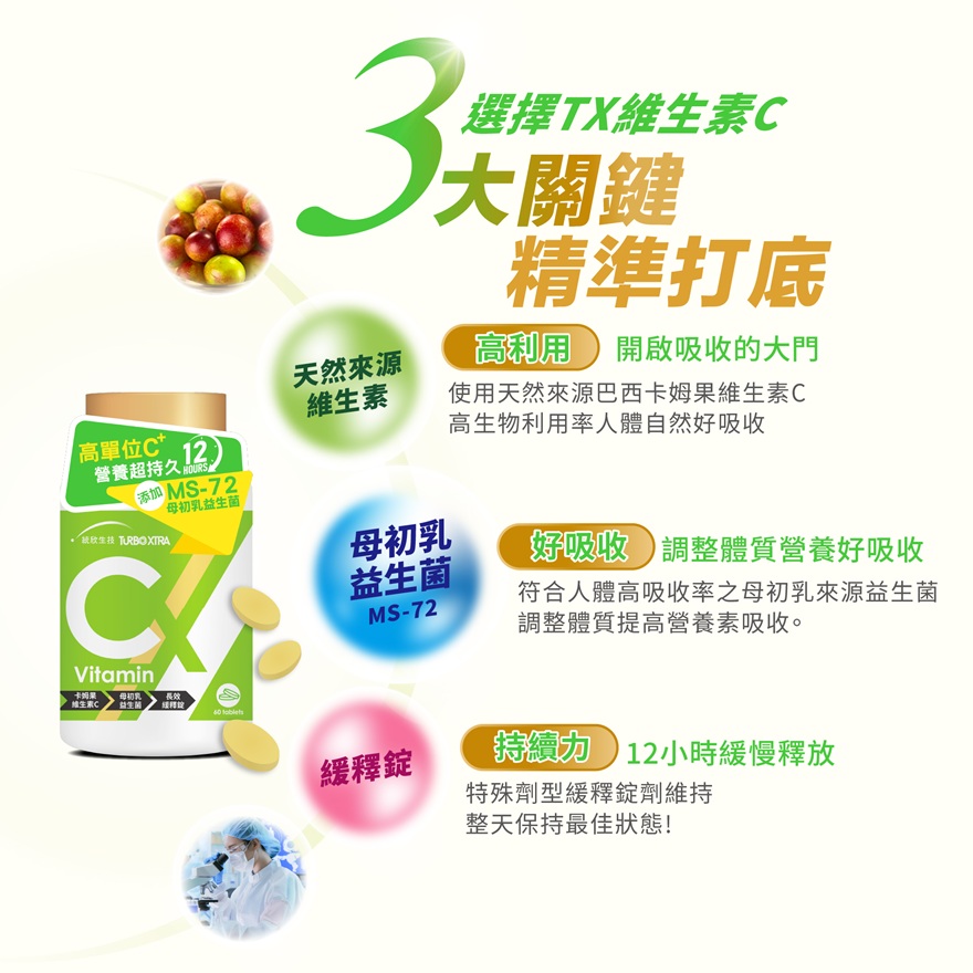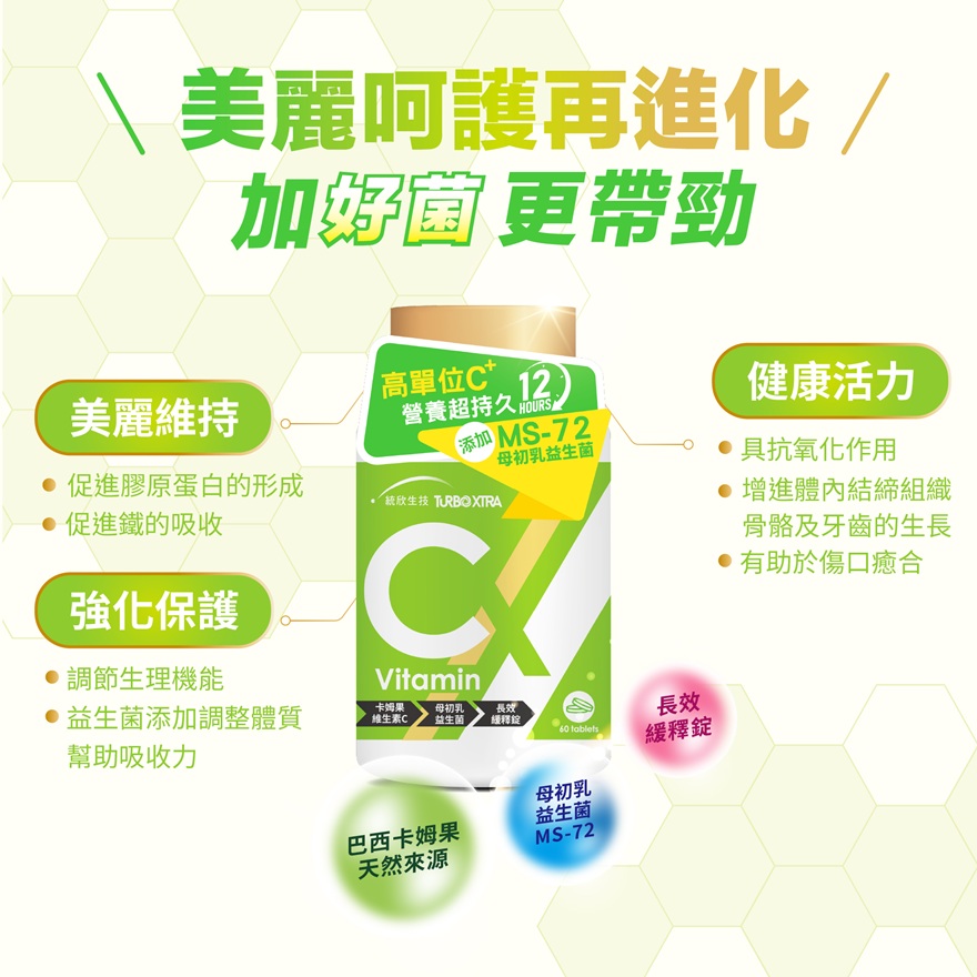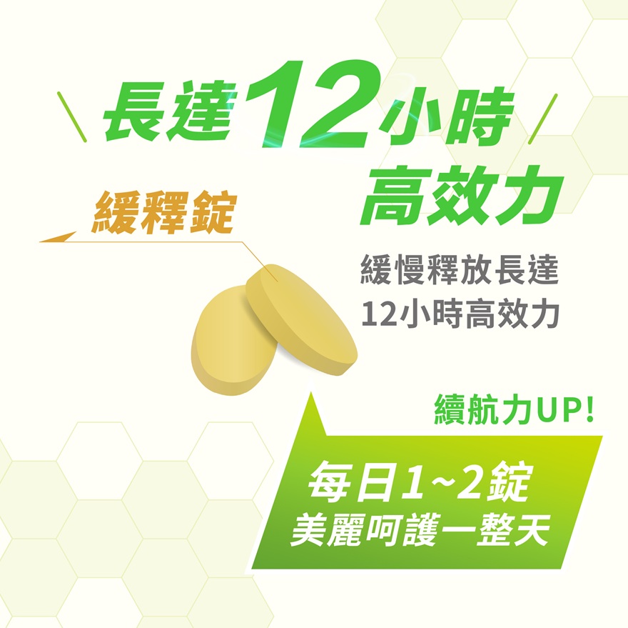 ●特殊劑型-緩釋錠:高單位維生素C,持續釋放12小時,輕鬆補充美麗不懈怠。