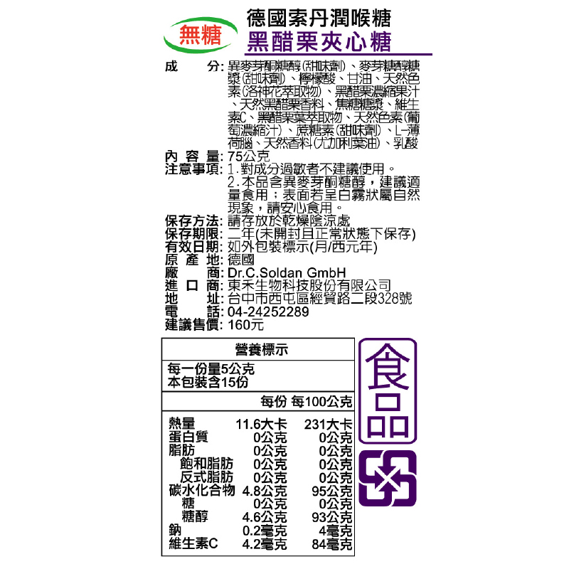 [德風]德國索丹潤喉糖(無糖)黑醋栗夾心糖