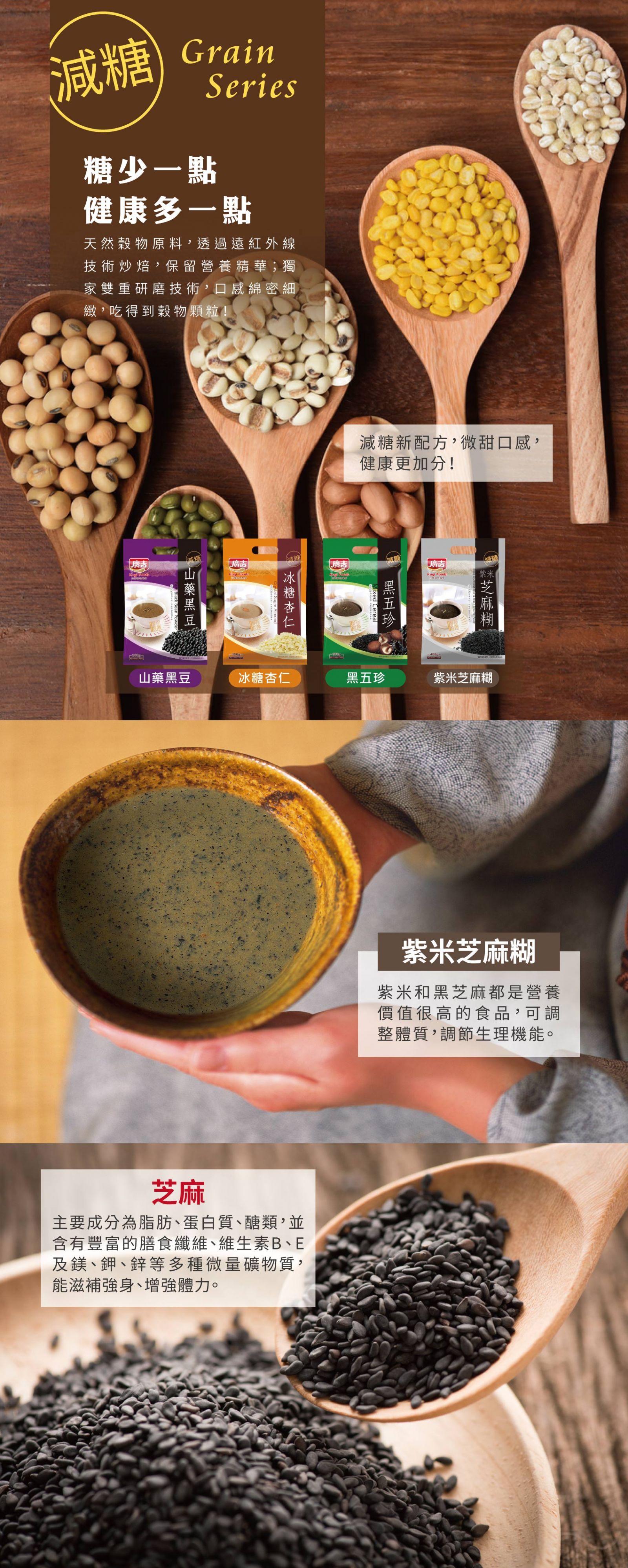 本產品嚴選上等芝麻,經遠紅外線炒焙後研磨,營養不流失,沖泡後香氣四溢,搭配種子及多種上選穀物;另添加紫米,是理想的滋補養身休閒飲品。