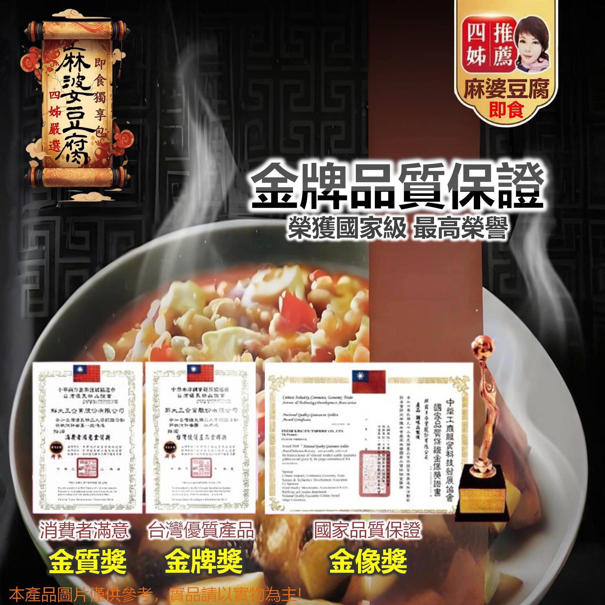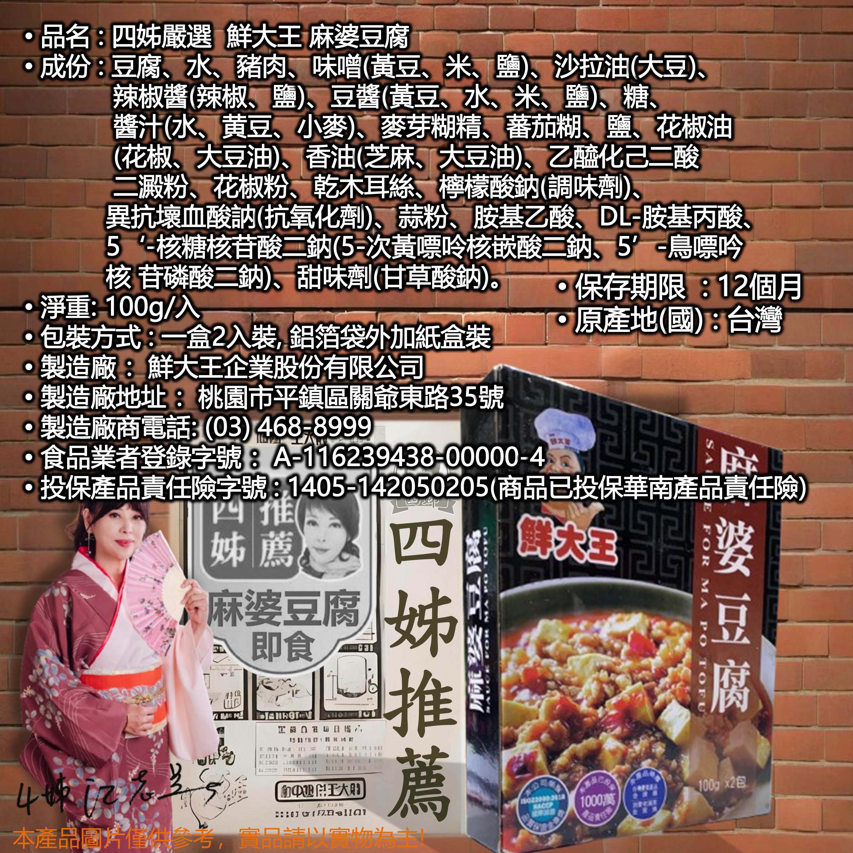 豆腐、水、豬肉、味噌(黃豆、米、鹽)、沙拉油(大豆)、辣椒醬(辣椒、鹽)、豆醬(黄豆、水、米、鹽)、糖、醬汁(水、黄豆、小麥)、麥芽糊精、蕃茄糊、鹽、花椒油(花椒、大豆油)、香油(芝麻、大豆油)、乙醯化己二酸二澱粉、花椒粉、乾木耳絲、檸檬酸鈉(調味劑)、異抗壞血酸訥(抗氧化劑)、蒜粉、胺基乙酸、DL-胺基丙酸、5+核糖核苷酸二鈉(5-次黃嘌呤核核嵌酸二鈉、5”-鳥嘌吟核苷磷酸二鈉)、甜味劑(甘草酸鈉)。