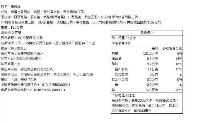 成分:精選土番鴨肉、食鹽、天然香辛料、天然燻料(甘蔗) 添加物:亞硝酸鈉、氯化鈉、銷酸鉀(保色劑)、L-麩酸鈉、胺基乙酸、5'-次黃嘌呤核苷磷酸二鈉、5'-鳥嘌呤核苷磷酸二鈉、DL-胺基酸、琥珀酸二鈉、檸檬酸鈉、L-天門冬酸鈉(調味劑)、異抗壞血酸鈉(抗氧化劑)