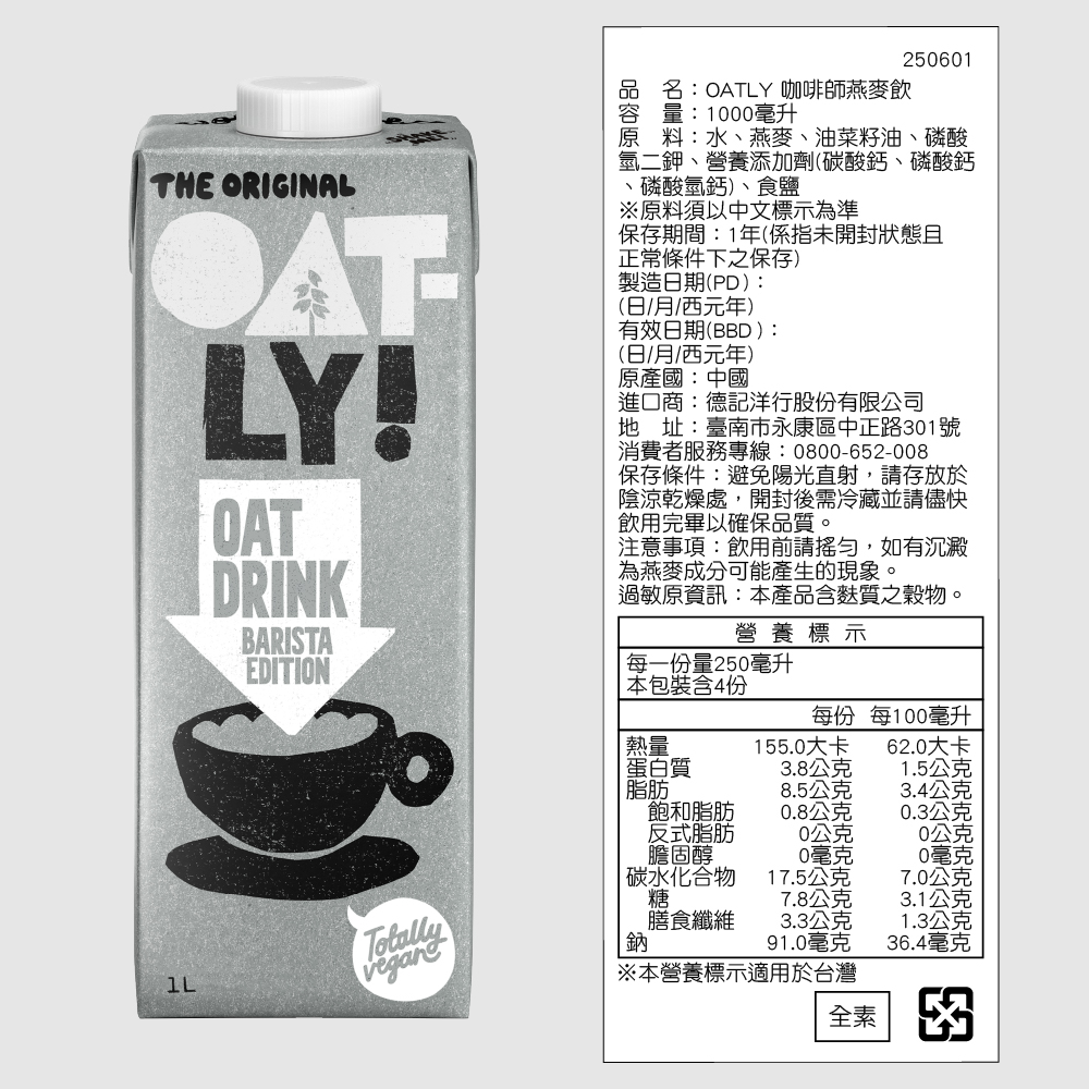 【德記洋行】OATLY 咖啡師燕麥奶 6瓶/箱 (1000ml/瓶)送阿原燕麥皂1入 送完為止(香港版)