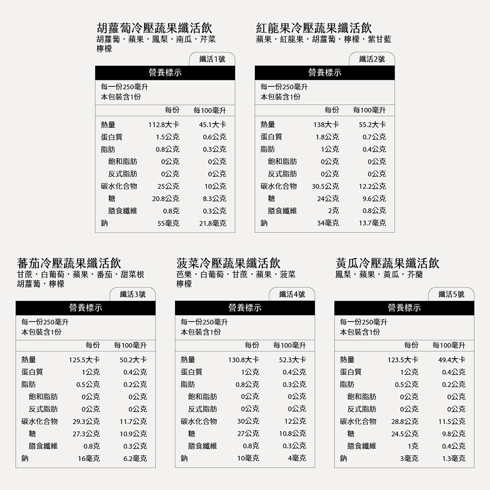 ▪︎ 纖活2號-紅龍果冷壓蔬果纖活飲:蘋果、紅龍果、胡蘿蔔、檸檬、紫甘藍 ▪︎ 纖活3號-蕃茄冷壓蔬果纖活飲:甘蔗、葡萄、蘋果、番茄、甜菜根、胡蘿蔔、檸檬 ▪︎ 纖活8號-甜菜根冷壓蔬果纖活飲:鳳梨、甘蔗、石榴、蘋果、芹菜、甜菜根、檸檬