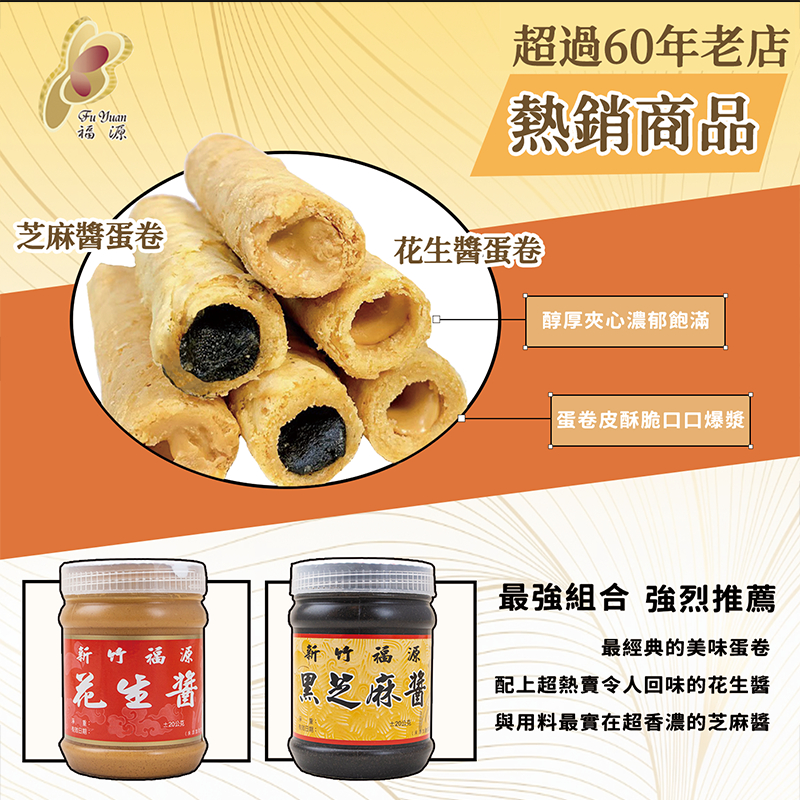 ✔️超過60年老字號名店出品 ✔️無添加防腐劑或化學添加物 ✔️堅持手工製造,不含一滴水 ️福源花生芝麻蛋捲禮盒(16入) 一次吃到兩種口味蛋捲 花生控、黑芝麻控的福音!
