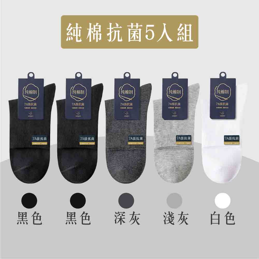 【JAR嚴選】7A抗菌精梳棉中筒吸汗透氣襪子5入組-黑2雙+深灰1雙+淺灰1雙+白色1雙