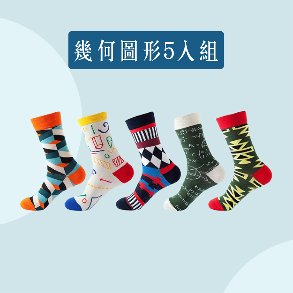 【JAR嚴選】INS男女情侶款潮流時尚圖案趣味個性中筒襪子5入組-幾何圖形5入組