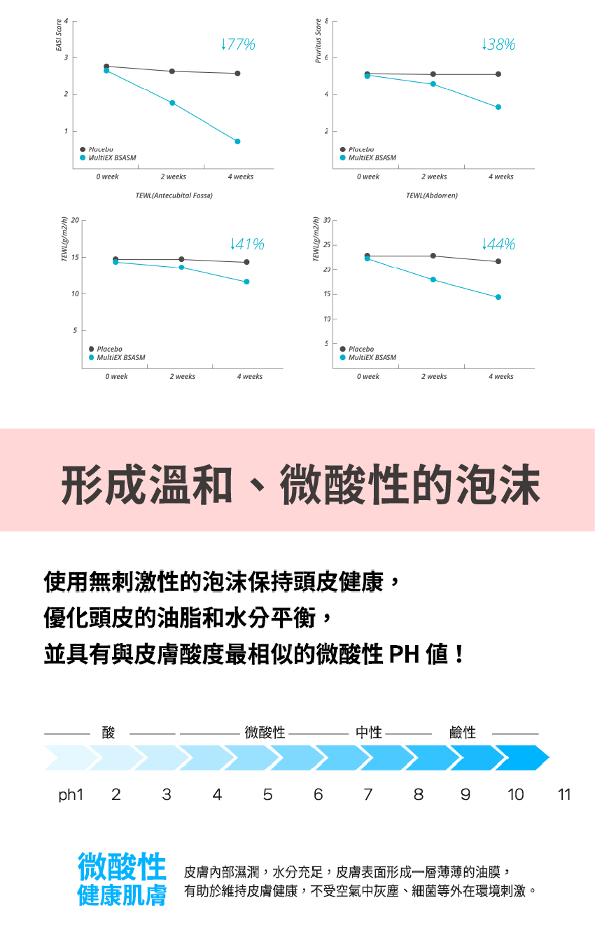 -微酸性泡沫:優化頭皮的油質和水分平衡,具有與皮膚酸度最相似的微酸性ph值。
