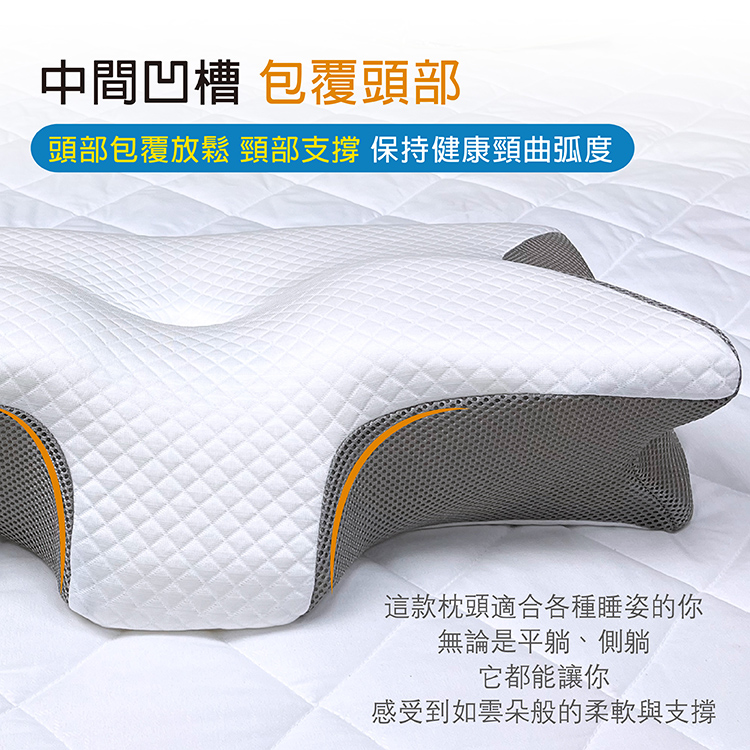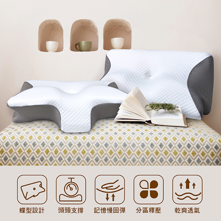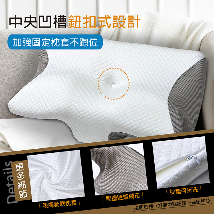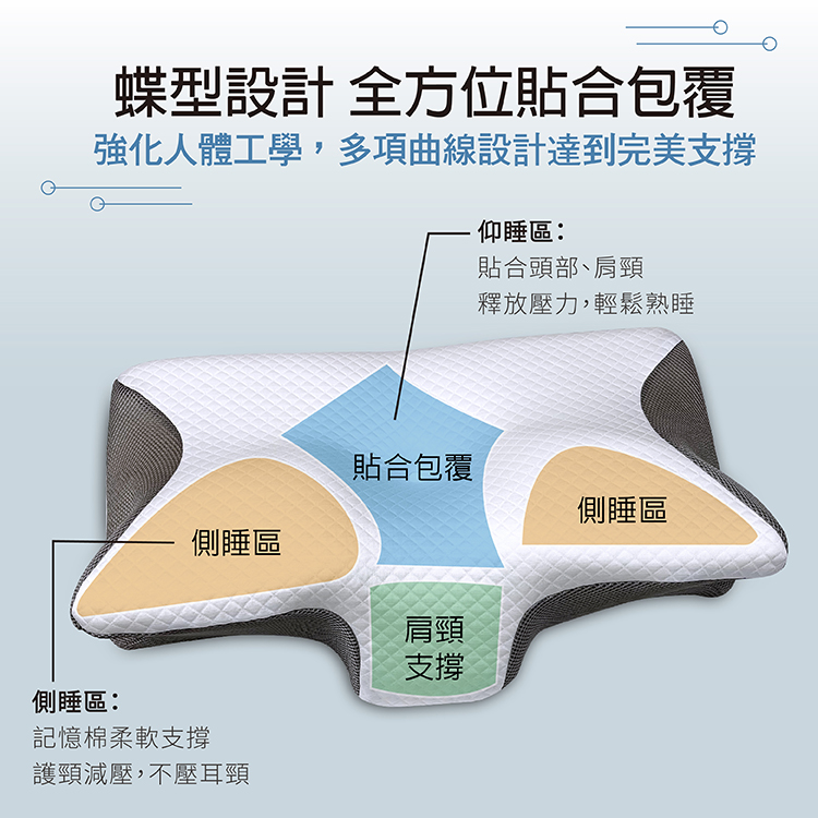 ★蝶型人體工學設計,分區釋壓★側邊翼型設計,雙手不壓迫★釋壓記憶棉內材,慢回彈服貼承托★中央凹槽鈕扣式設計,加強固定枕套不跑位★柔軟親膚枕套,拉鍊設計方便拆洗