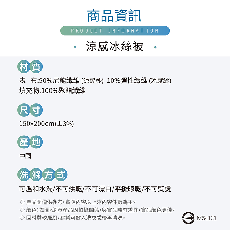 ★產地:中國★內容件數與尺寸:150*200cm -雪肌涼感紗夏涼被*1★產品圖僅供參考,實際內容以上述內容件數為主。★顏色:如圖,網頁產品因拍攝關係,與實品略有差異,實品顏色更佳。★清潔保養方式:可水洗╱不可乾洗╱不可漂白╱平放乾燥╱不可熨燙
