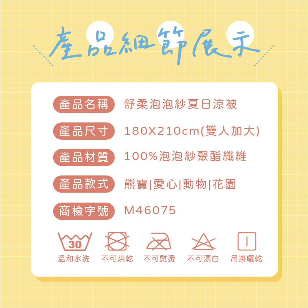 品名:【Pure Sleep 純好眠】舒柔泡泡紗夏日涼被 雙人加大面料材質:泡泡紗聚酯纖維尺寸:180*210cm(±2cm)款式:熊寶/愛心/動物/花園產地:中國經銷商:茂榕數位科技有限公司地址:桃園市平鎮區廣東路57巷1號電話:0800-666865【注意事項】※商品圖片為實物拍攝,由於螢幕顯示色差、拍攝光線等因素,照片與實物可能略有差異,請以實物為準。※商品尺寸為人工測量,標示僅供參考,難免與實際商品尺寸略有誤差,誤差尺寸±2cm為國際驗貨標準可接受範圍。※拆封商品後,若有任何問題請先聯繫客服,將有專員為您服務。※注意! 以下說明不屬瑕疵範圍:1. 小於1-3cm尺寸測量誤差、些微不對稱2. (1cm極小污點/摺痕/刮痕/螢幕色差等3. 些微脫線/勾針/線頭/味道/五金刮痕4. 人為造成損壞或使用痕跡【退貨需知】※拆封商品時,為了保障雙方權益,開封時務必錄影留證。※鑑賞期為猶豫期,並非試用期。※提醒您!商品需要全新且包裝完整的情況下,才能辦理退貨退款;棉被屬於個人衛生用品,一旦經拆封或使用,易有接觸肌膚衛生疑慮,商品價值已受損,除非為瑕疵商品,否則無法受理退貨,購買使用前須特別留意,避免影響自身權益!