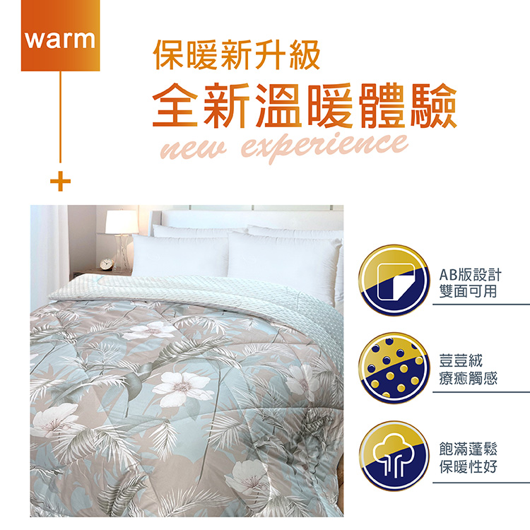 ★保暖新升級 全新溫暖體驗★雙面不同面料觸感設計,兩面皆可用★療癒顆粒觸感,又兼顧保暖★保暖性和蓬鬆性特佳舒服又溫暖★可直接蓋也可以當內被胎使用★台灣製造品質保證