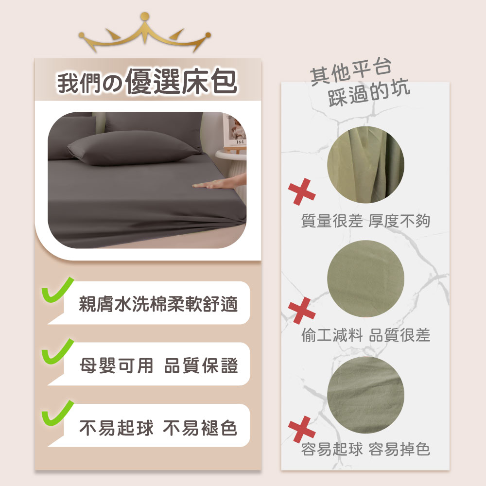 品名:【Pure Sleep 純好眠】A級親膚極柔床包 雙人加大面料材質:100%聚酯纖維工藝:活性印染尺寸:180*200cm(±2cm)款式:豆沙色/灰藍色/銀灰色/深灰色內容:床包*1(不含枕套)產地:中國進口商:茂榕數位科技有限公司地址:桃園市平鎮區廣東路57巷1號電話:0800-666865【注意事項】※商品圖片為實物拍攝,由於螢幕顯示色差、拍攝光線等因素,照片與實物可能略有差異,請以實物為準。※商品尺寸為人工測量,標示僅供參考,難免與實際商品尺寸略有誤差,誤差尺寸±2cm為國際驗貨標準可接受範圍。※拆封商品後,若有任何問題請先聯繫客服,將有專員為您服務。※注意! 以下說明不屬瑕疵範圍:1. 小於1-3cm尺寸測量誤差、些微不對稱2. (1cm極小污點/摺痕/刮痕/螢幕色差等3. 些微脫線/勾針/線頭/味道/五金刮痕4. 人為造成損壞或使用痕跡【退貨需知】※拆封商品時,為了保障雙方權益,開封時務必錄影留證。※鑑賞期為猶豫期,並非試用期。※提醒您!商品需要全新且包裝完整的情況下,才能辦理退貨退款;床包屬於個人衛生用品,一旦經拆封或使用,易有接觸肌膚衛生疑慮,商品價值已受損,除非為瑕疵商品,否則無法受理退貨,購買使用前須特別留意,避免影響自身權益!