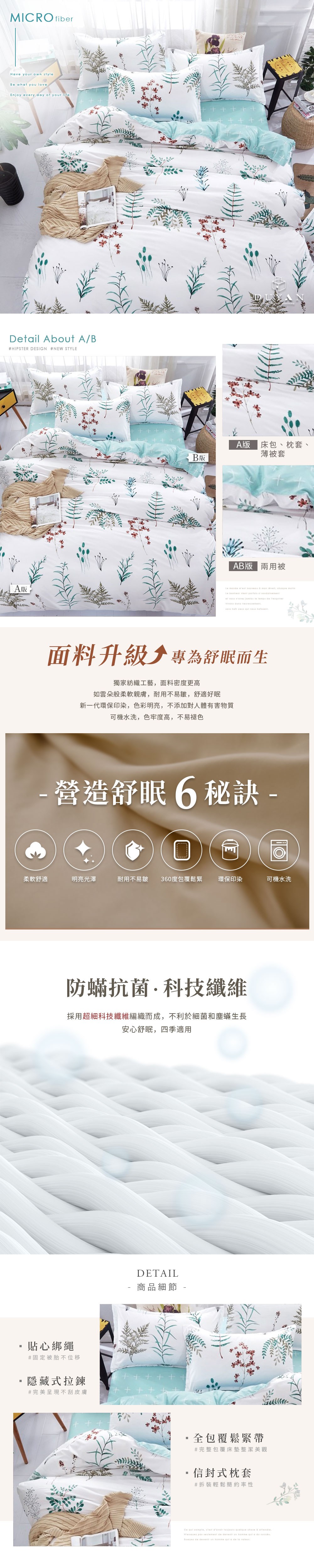商品特色觸感柔軟細緻,色澤明亮嚴選布料,精密剪裁專業車工全包式鬆緊帶,床包不易鬆脫鋪棉兩用被套設計,四季可用尺寸說明單人三件式鋪棉兩用被床包組單人薄床包3.5x6.2尺(105x186cm) x1 / 可包覆床墊厚度:約28cm±5%雙人鋪棉兩用被套6x7尺(180x210cm) x1枕套(45x75cm±5%) x1商品說明▪ 材質: 100%聚酯纖維▪ 填充物:100%聚酯纖維▪ 產地:台灣/越南▪ 床包:採用全包覆式鬆緊帶,可防止床包滑動▪ 枕套:美式信封枕套▪ 被套:有四角綁繩
