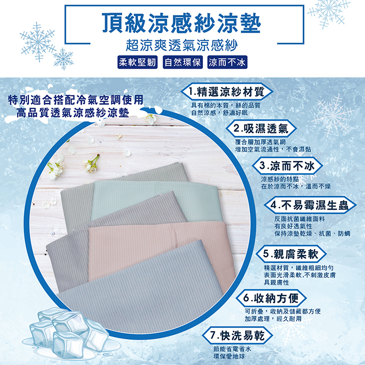 ★精選涼紗材質,吸濕透氣更舒適★涼而不冰,溫而不躁,乾爽舒適★可折疊設計,方便收納★搭配空調舒適加倍,四季皆可使用