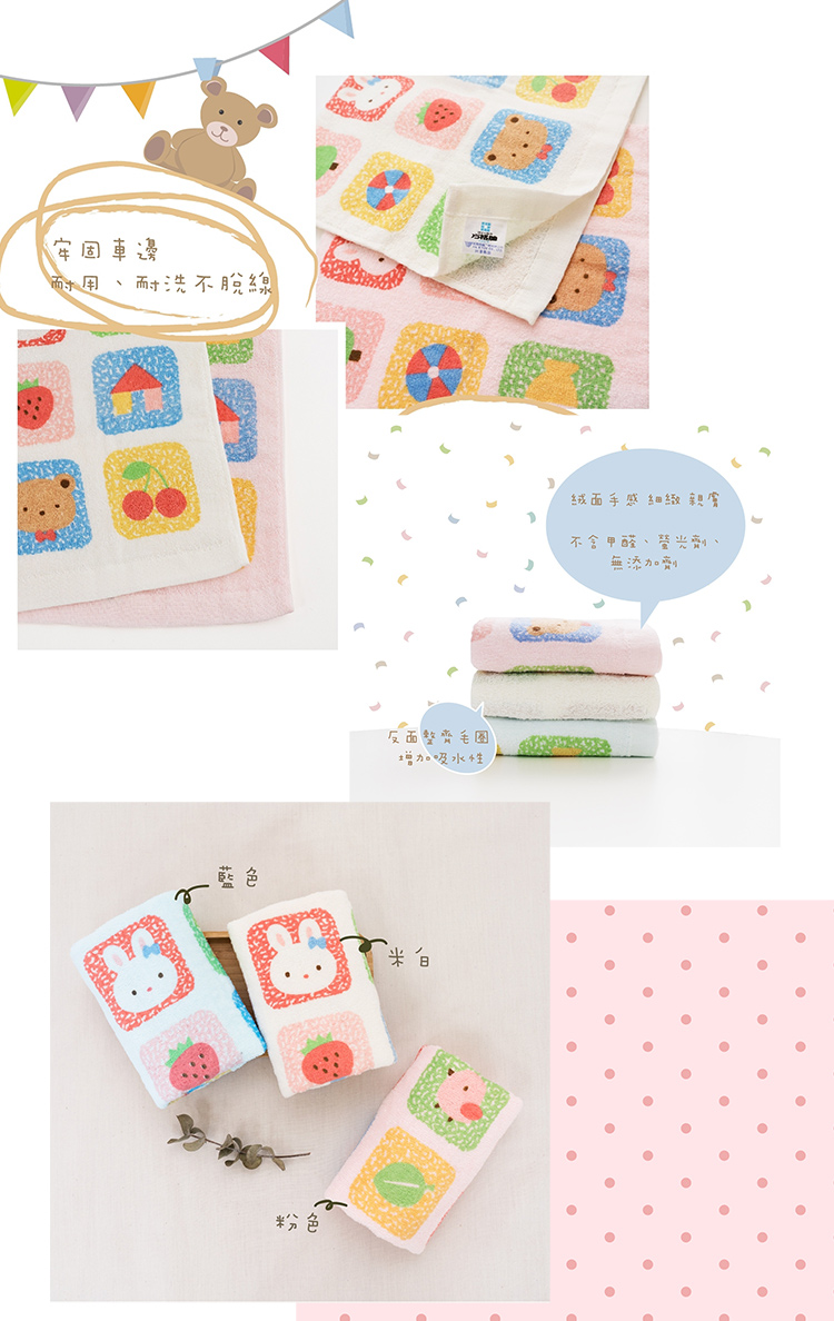 臺灣製造品質安心,100%純棉材質觸感柔細低棉絮,超可愛動物圖案,不論是大人還是小寶貝都可以使用,使用起來超細緻,輕薄快乾溫和去除污垢。