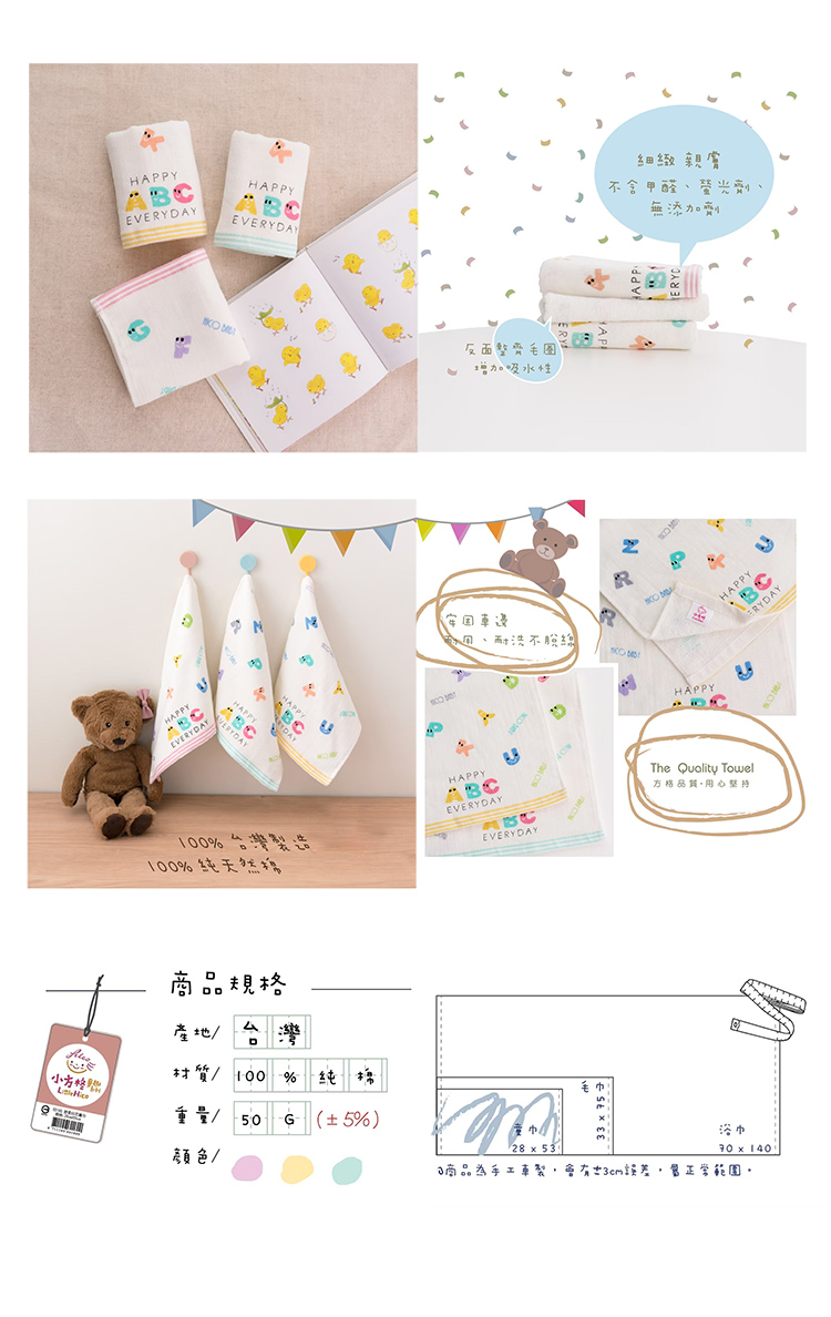 臺灣製造品質安心,100%純棉材質觸感柔細低棉絮,超可愛動物圖案,不論是大人還是小寶貝都可以使用,使用起來超細緻,輕薄快乾溫和去除污垢。