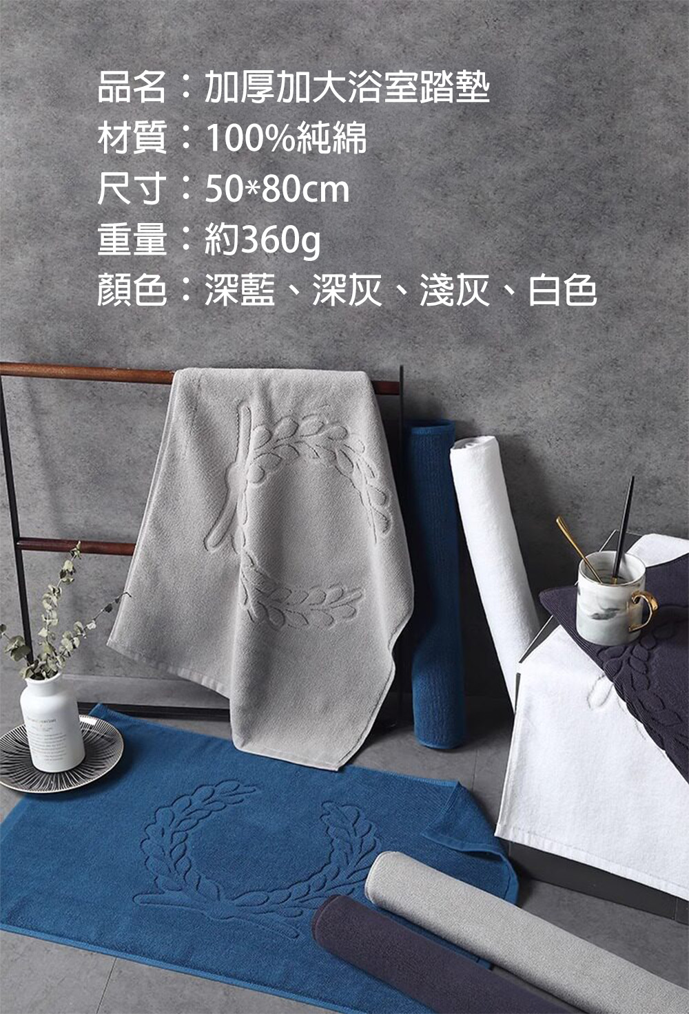 浴室腳踏墊【深沉灰 50*80cm】五星級飯店地墊 浴室地毯 踏墊 吸水墊 100%純棉 瞬吸速乾 飯店風 麥穗壓花 精梳棉