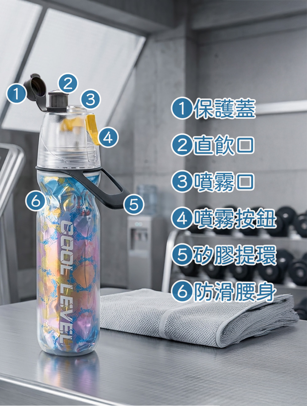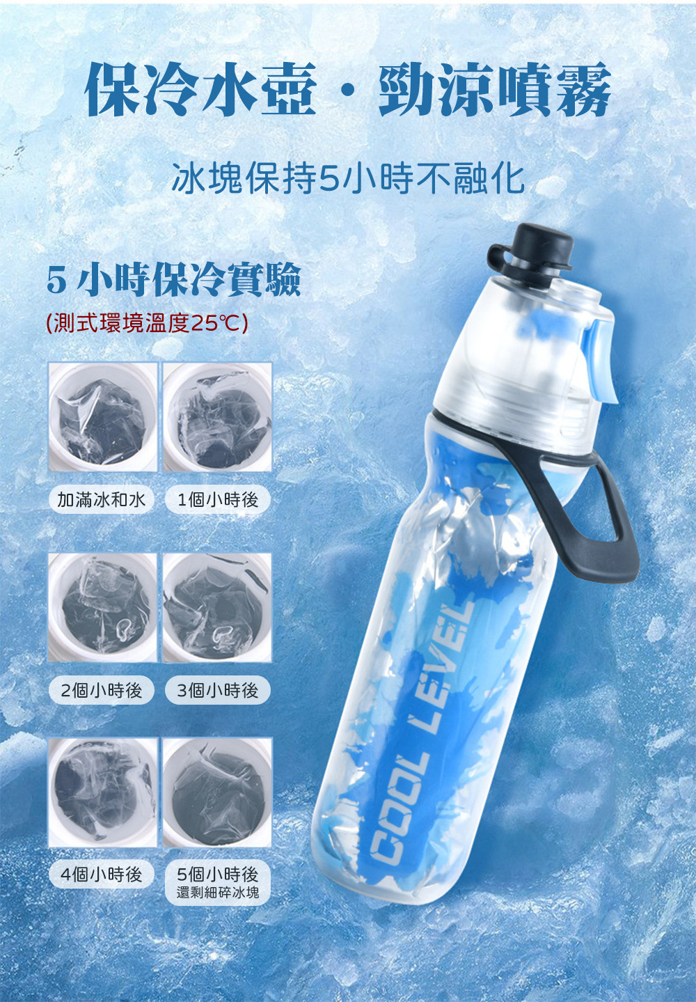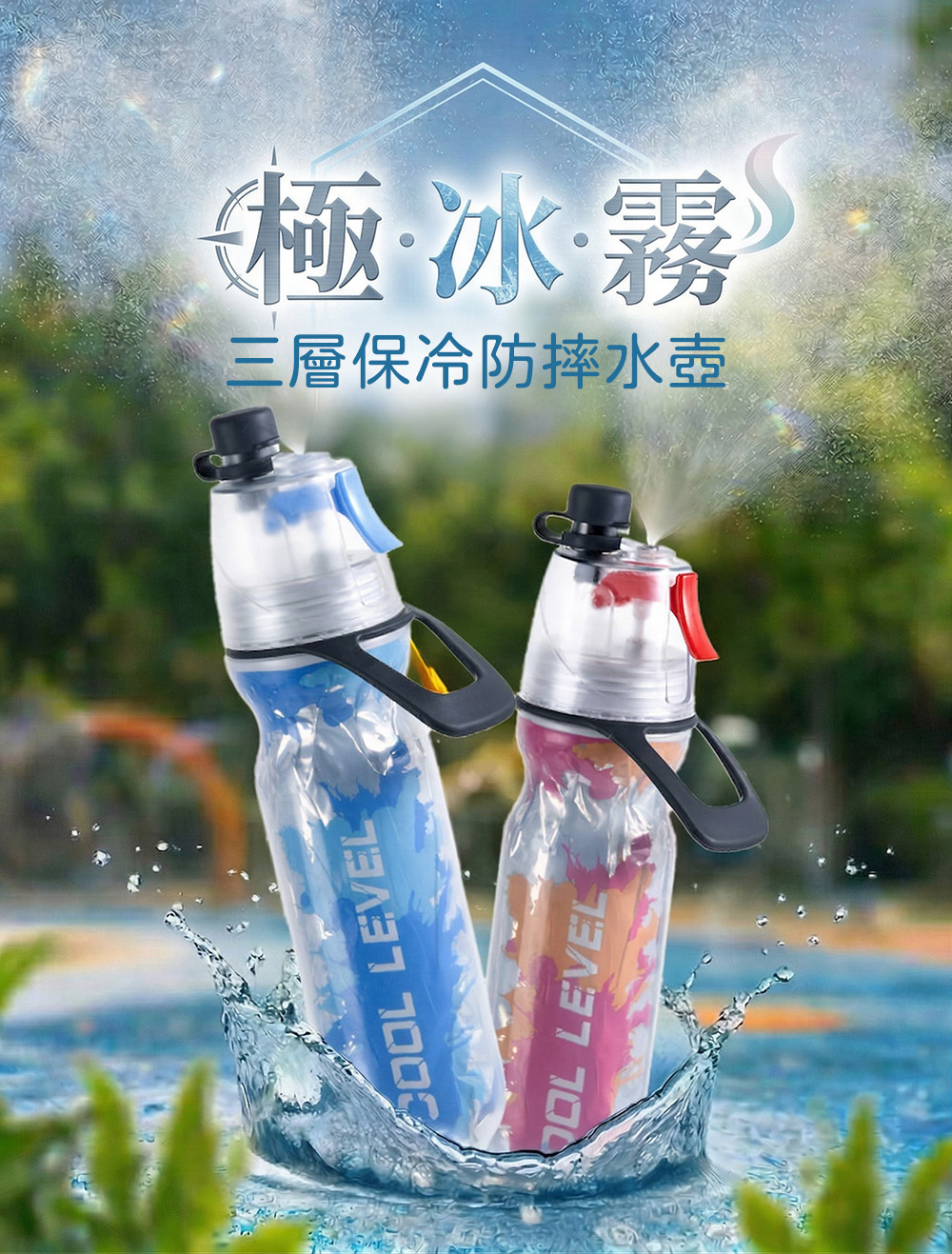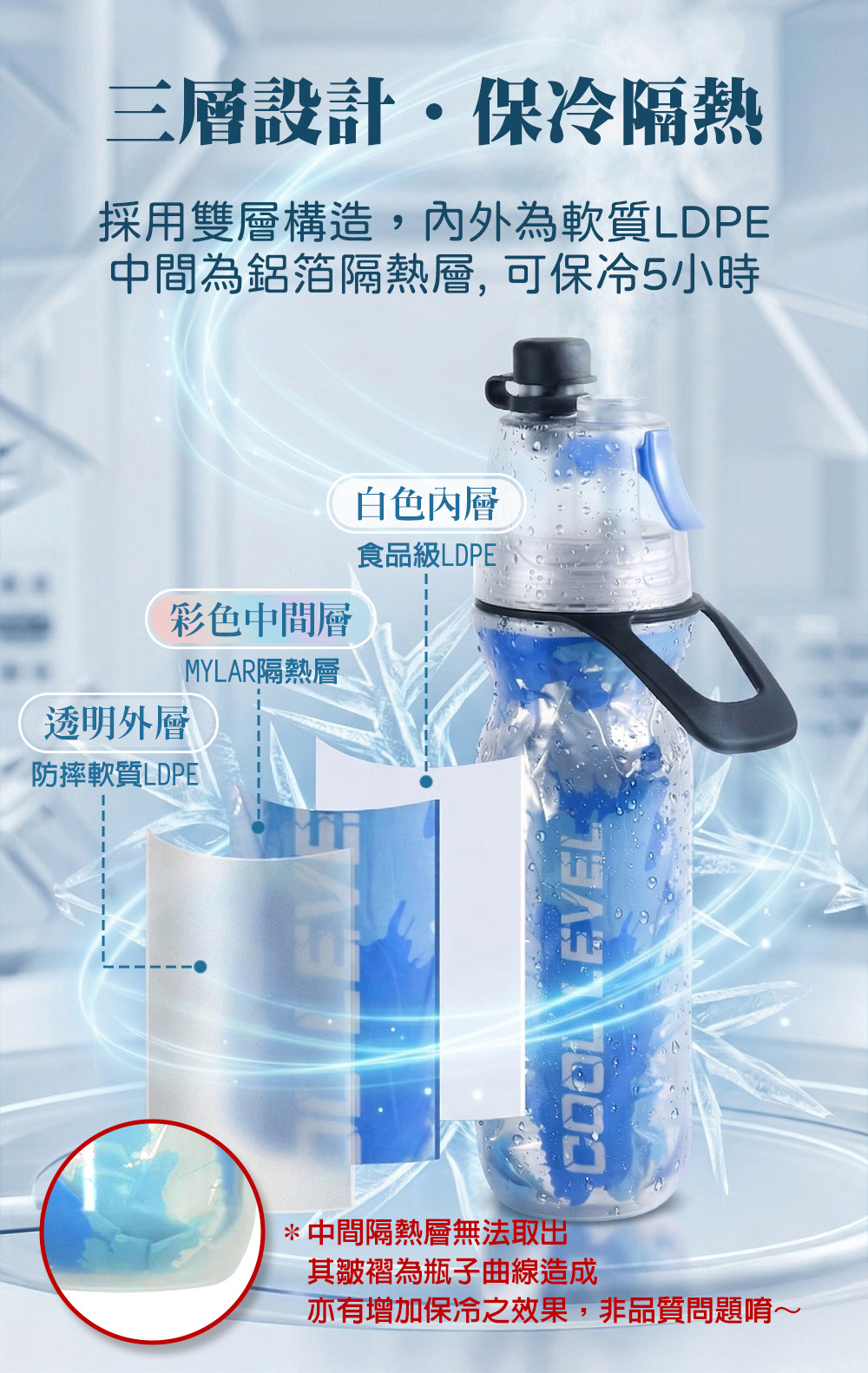 設計: 三層複合保冷構造、上拉式直飲口、一鍵按壓式噴霧噴頭