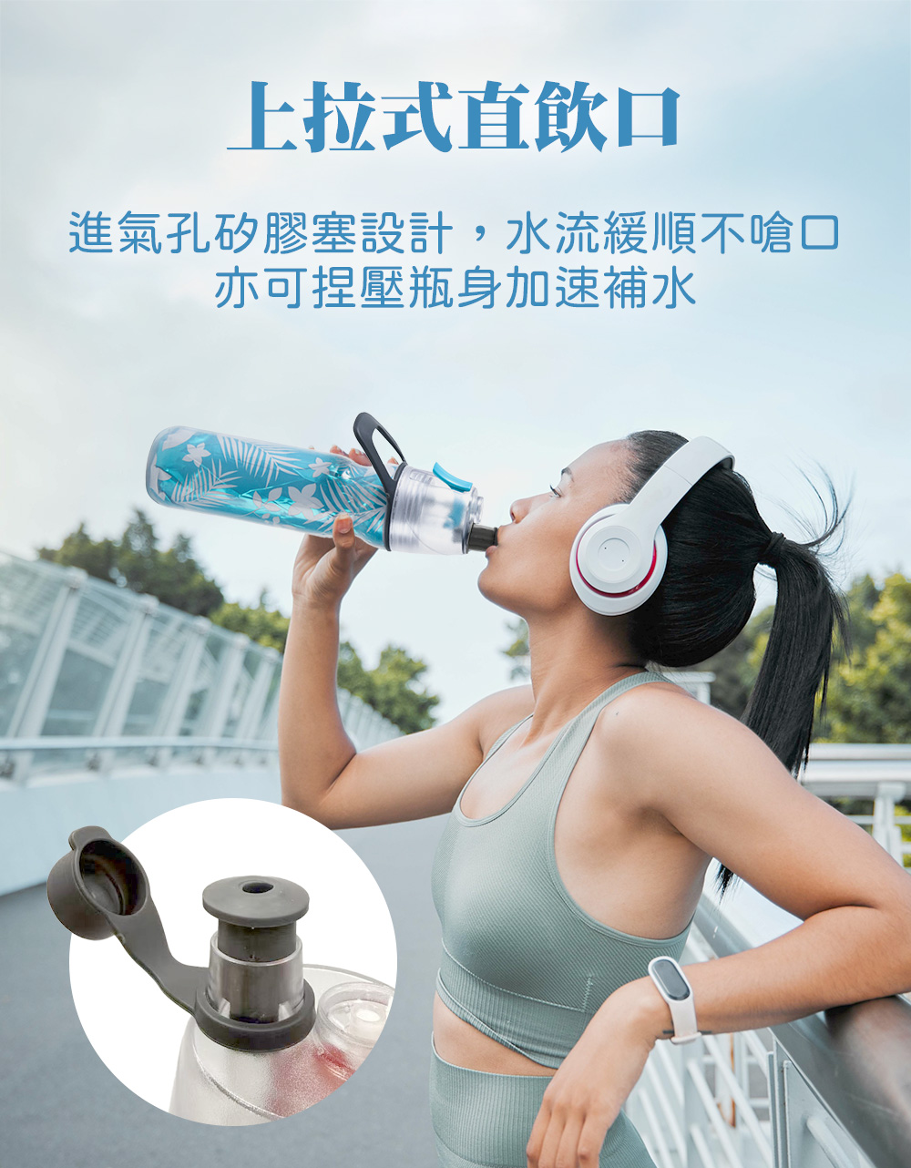 直飲補水: 將上拉式飲口向上拉起即可直接飲用;飲用完畢後扣上防塵蓋壓下飲口。