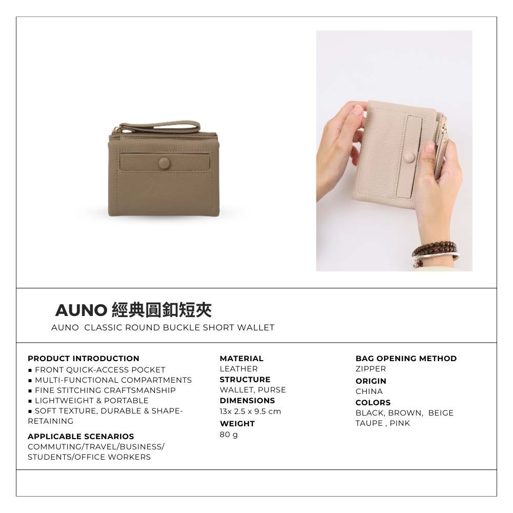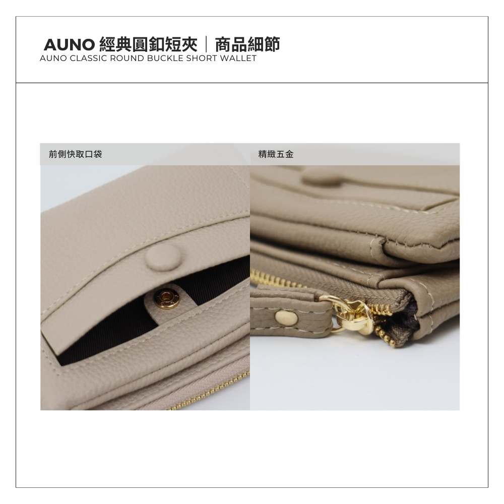 AUNO 經典圓釦短夾-黑色 多卡位收納皮夾 女用錢包 典雅百搭