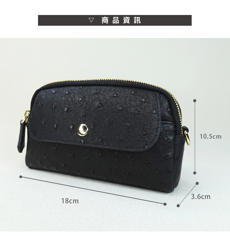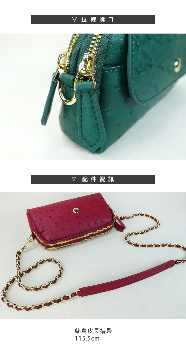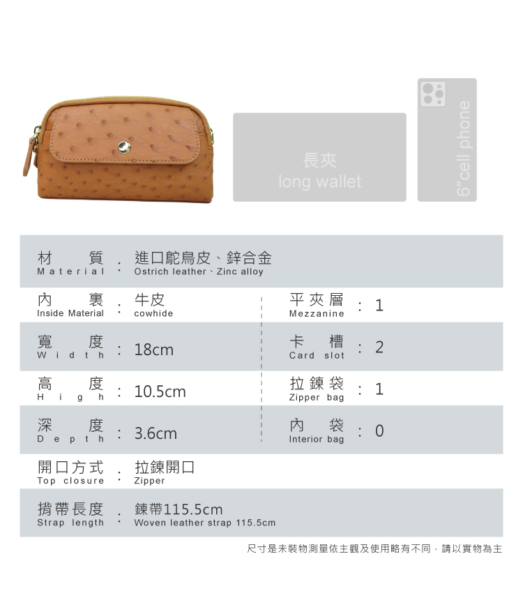 ◆材質:進口鴕鳥皮、鋅合金◆內裡:耐汙尼龍布◆尺寸:18*10.5*3.6cm / 鏈帶115.5cm◆產地:中國澳門◆保固期限:1年◆保固範圍:保固期限內,非人為損壞下,可免費維修。※鴕鳥皮屬於天然珍稀皮革,每一只包都有獨特的天然動物紋路※商品照片僅供參考 請以實品為主※尺寸是未裝物測量依主觀及使用略有不同,請以實物為主