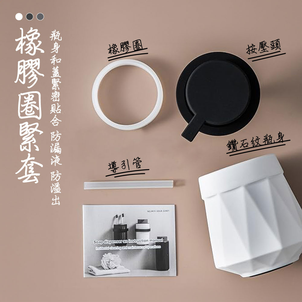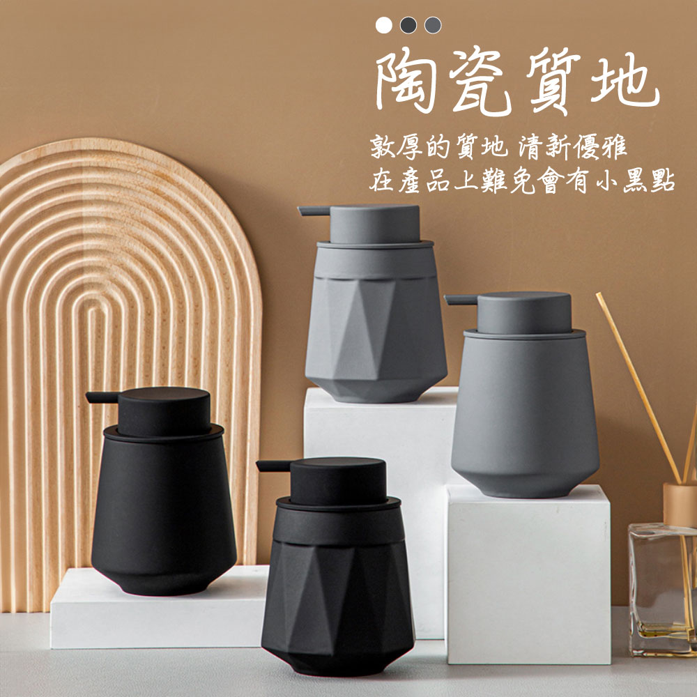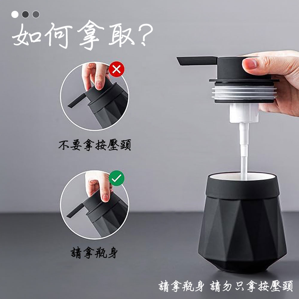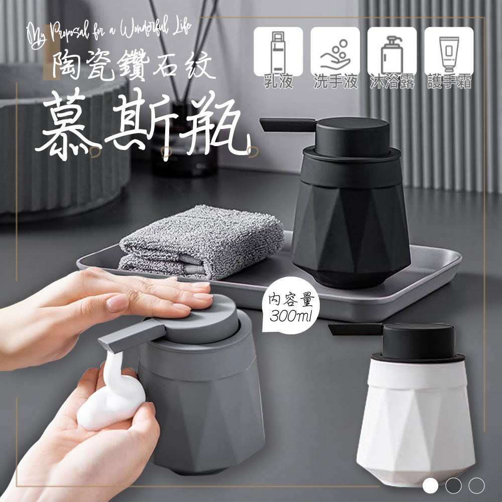 🏠✨ 陶瓷鑽石紋慕斯瓶📏 尺寸:9.5*13cm💧 容量:300ml🌈 顏色:曜石黑-幕斯專用款/優雅白-幕斯專用款/大象灰-幕斯專用款(只適合慕斯使用)曜石黑-一般款/優雅白-一般款/大象灰-一般款(適合用乳液/液體/凝膠/凝露)📏 重量 : 約500g🌿 以簡約主義詮釋美學生活,用簡單形式傳達豐富思想。陶瓷質感,清新優雅,小黑點、缺釉屬正常現象,不影響美觀及使用。💎 鑽石切割面,手感穩固,兼具精緻立體感。不生鏽、不氧化,呈現霧面質感。🖐️ 按壓面積大,貼合手掌,按壓自動起泡,泡沫豐富。適合慕斯洗手液,使用簡易,瓶口橡膠圈緊套,防漏液。🎨 嚴選陶瓷材質,外部採用北歐硅膠漆新工藝,加入點綴,更具氣質。🛁 簡約生活從家居開始,享受品質生活,從細節開始。