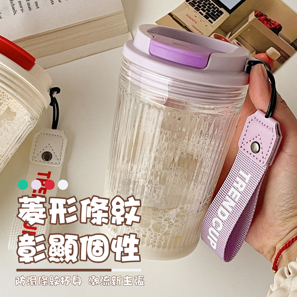 條紋杯身 防滑個性圓滑杯口 入口方便便捷提繩 一拎即走商品尺寸:14*7.5cm商品材質: 杯身玻璃/蓋子塑膠商品內容量: 400ml商品顏色: 孔雀綠/薰衣草紫/胭脂紅/天使白*透明條紋*小巧便攜*開蓋直飲 *耐冷耐熱 精心用材