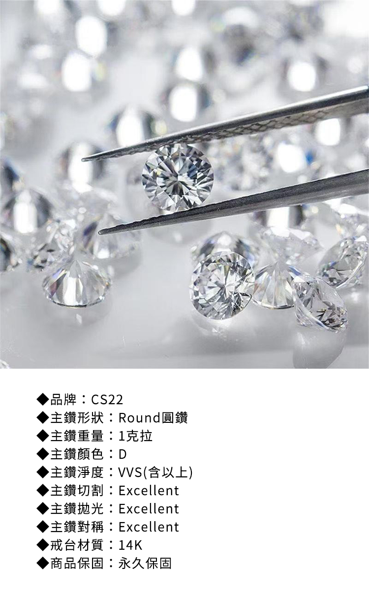 ◆品牌:CS22◆主鑽形狀:Round圓鑽◆主鑽重量:1.00克拉◆主鑽顏色:D◆主鑽淨度:VVS(含以上)◆主鑽切割:Excellent◆主鑽拋光:Excellent◆主鑽對稱:Excellent