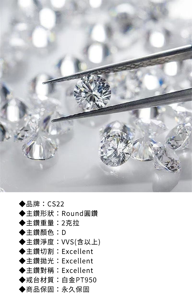 ◆品牌:CS22◆主鑽形狀:Round圓鑽◆主鑽重量:2.00克拉◆主鑽顏色:D◆主鑽淨度:VVS(含以上)◆主鑽切割:Excellent◆主鑽拋光:Excellent◆主鑽對稱:Excellent