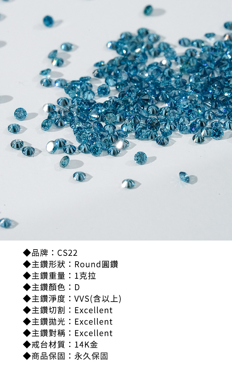 ◆品牌:CS22◆主鑽形狀:Round圓鑽◆主鑽重量:1.00克拉◆主鑽顏色:D◆主鑽淨度:VVS(含以上)◆主鑽切割:Excellent◆主鑽拋光:Excellent◆主鑽對稱:Excellent