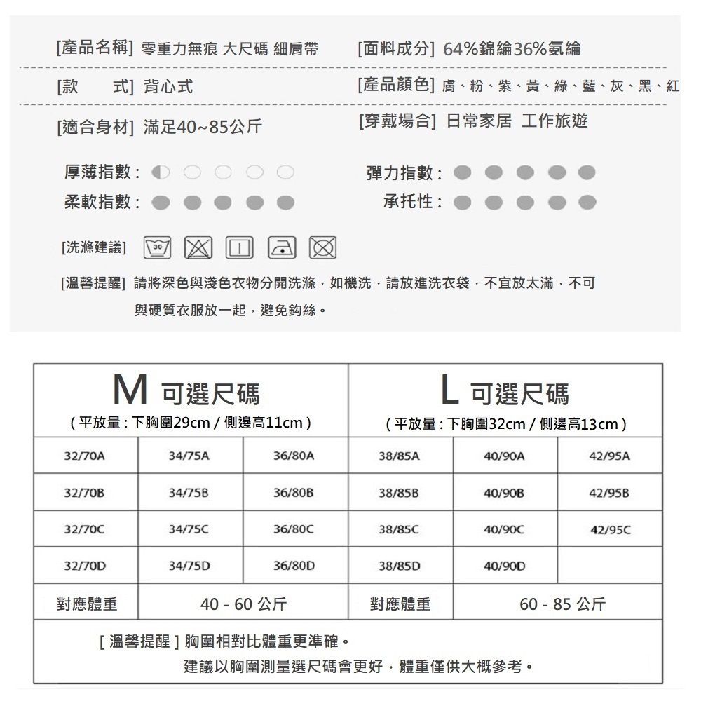 【A&R】零重力無痕大尺碼細肩帶內衣 顏色:紫 尺寸:L(適合60-85KG) 成份:64%錦綸、36%氨綸 產地:CHINA ●此為私密物品,只提供鑑賞,退貨需保持無使用過且吊牌未拆剪及未下水過的狀態 ●退貨請於鑑賞期內辦理,必須保持吊卡完整及商品組合之齊全(包含購買商品、附件、內外包裝及包裝彩盒、贈品…等,均務必保持完整齊全) ●產品顏色因每台螢幕顏色解析及設定的不同,多少會有些微色差,請以實品為主 注意事項: 布料染料時,深色比淺色不易固色,因此深色衣服下水時,會見水中有許色水,此屬正常現象,請您別擔心,請安心穿著! 洗滌方法:手洗(深色衣物與淺色衣物請分開洗,請勿浸泡) ,可以使用洗衣機、脫水機清洗,請使用中性洗劑,加入少許清水,待充分溶解後再放入衣物清洗。 #A&R #零重力 #無痕 #大尺碼 #細肩帶 #寬肩帶 #AIR SKIN BRA #透氣 #無鋼圈 #無痕內衣