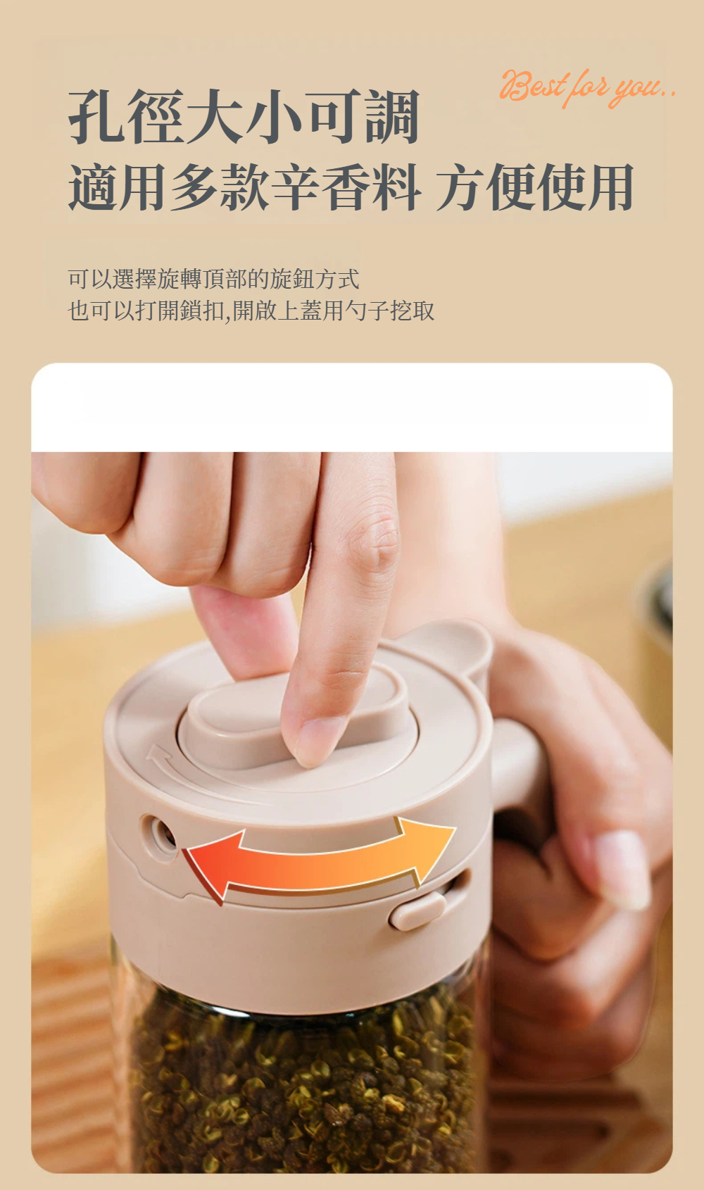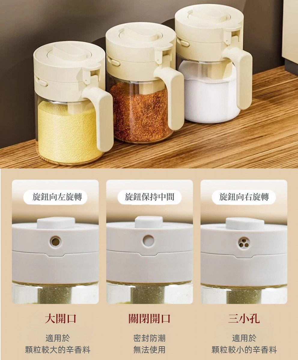 想倒就倒、想挖就挖,適用鹽、糖、胡椒、辣椒粉等各式調味料。