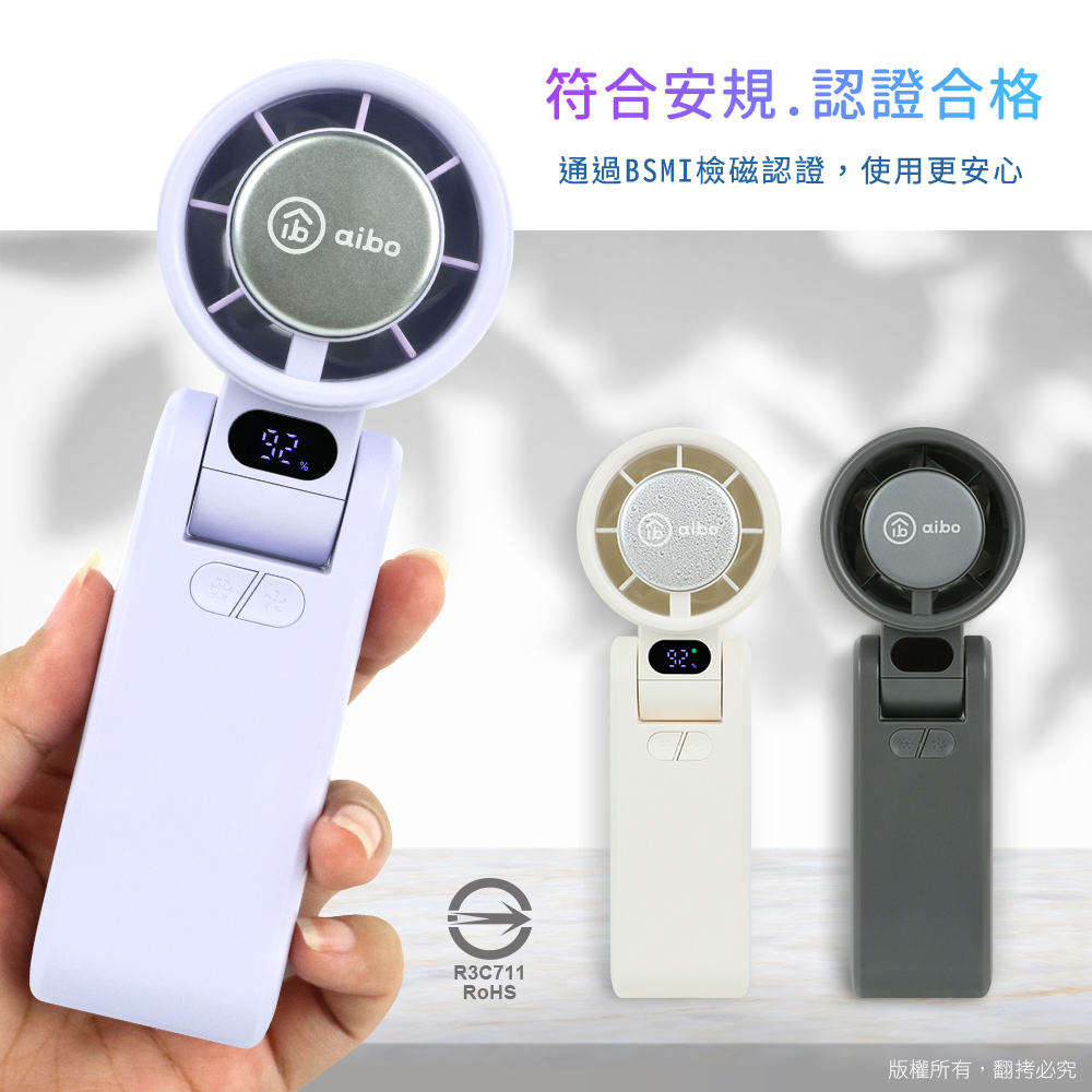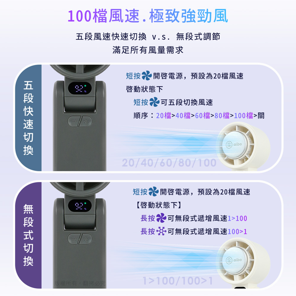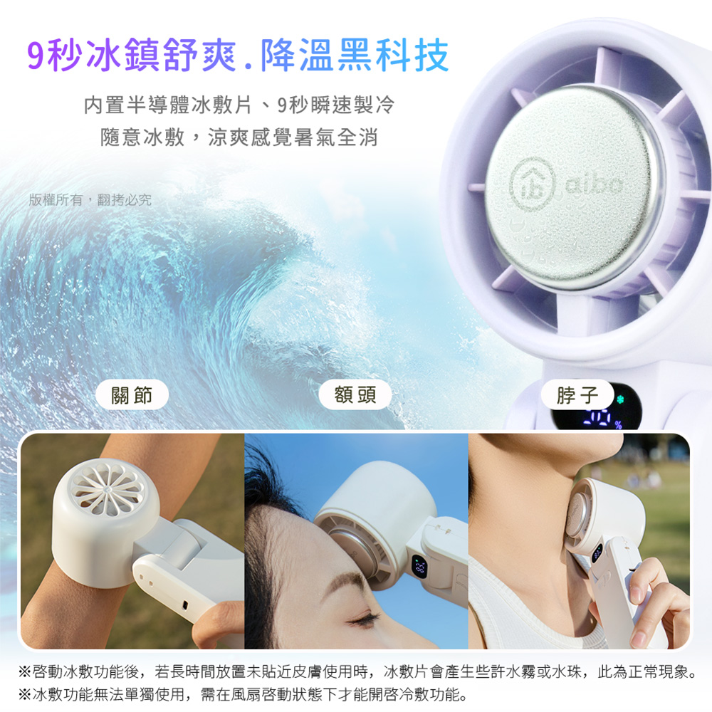 【風速調整】 風扇啟動狀態下,短按電源鍵可5段式調整風速(20>40>60>80>100>關)。 長按電源鍵可無段式增速(1>100),長按冰敷鍵可無段式減速(100>1) 【冰敷功能】啟動風扇後,短按冰敷鍵開啟冰敷功能。 ※需在風扇啟動後才能開啟冰敷功能! 注意事項: .使用前請詳閱內附說明書。.冰敷功能無法單獨開啟,需在風扇啟動狀態下才能開啟使用。.啟動冰敷功能後,長時間放置未貼近皮膚使用時,冰敷片會產生些許水霧或 水珠,此為正常現象。.本產品不適合六歲以下孩童使用,兒童使用時建議應該成年人陪同,以確保 孩童不嬉玩產品。.兒童使用時應由成年人陪同,請勿讓兒童在無人看管的情形下單獨使用。.請勿將本產品放置於高溫/高濕/悶熱不通風或是暖氣設備附近。.請勿將產品置於高處或不平坦檯面、地面,以免掉落損壞。.請勿使用超出產品負荷電源,導致產品發熱及電路板燒壞。.本產品請勿靠近水源/火源或是私自將產品拆開,以免產品損壞或發生故障。.不可在浴室等潮濕或可能接觸到水的地方使用。.充電時,請勿將產品放置在易燃物品上(床/毛毯/書籍…等)。.當使用時,風速時強時弱,表示內建電池快沒電,請即時充電後再使用。.風扇運轉時,請勿將手或任何細長/尖銳等物品,靠近風扇葉片,以免發生危險 或造成機器損壞。.本產品不預期提供生理、感知、心智能力、經驗或智識不足之使用者(包含兒童) 使用,除非在對期負有安全責任的人員之監護或指導下安全使用。.僅可使用USB to Type-C線材充電,若使用雙頭Type-C PD線材,會無法正常充電。.若長期不使用時,建議每個月為產品充一次電,以延長電池使用壽命。.本產品內置不可拆卸充電式鋰電池,請勿私自拆卸。請勿敲打、撞擊本產品。.本產品內置鋰電池,如要丟棄請與一般垃圾分開處理。.本產品嚴禁隨意丟棄或焚燒,產品內置電池可能因此引發爆炸危險。.商品圖檔顏色因電腦螢幕設定差異會略有不同,以實際商品顏色為準。.重量與尺寸皆採手工測量,±3%誤差屬正常範圍。 轉載敬告: 鈞嵐(立嵐)之商品圖文、影片或商標等,皆屬鈞嵐(立嵐)版權所有, 若未經同意即任意轉載刊登者,我司將進行相關智慧財產著作權與 商標權及商業法的追訴權利。 產品規格: .型 號:HA-FAN1145.產品名稱:aibo 半導體冰敷 折疊頸掛 100檔調速手持風扇.產品顏色:沉穩灰/浪漫紫/人文白.商品尺寸:約 5.5 x 6 x 16.8 cm.商品重量:約 226 g.電池型式:可充電鋰電池(鋰離子電池).電池容量:3600mAh.電池電壓:DC 3.7V.充電介面:Type-C.額定輸入:DC 5V/2A.工作功率:5W.風扇轉速:最高約 13000 RPM±10%.充電時間:約 4.5 小時 (依充電方式不同而有所遞增).使用時間:約 1.5~8 小時 (單獨風扇使用時間) 約 1~2 小時 (冰敷+風扇使用時間).充電指示:0~100% 螢幕數字遞增.商品材質:ABS、電子零件.驗證型號:CYKE-650.驗證登錄:R3C711 RoHS.包裝內含:風扇 x1、充電線 x1、掛繩、說明書 x1.商品保固:非人為因素下,本產品自購買日起保固三個月 內附線材與掛繩屬耗材品,不在保固範圍內(新品瑕疪除外).產 地:中國大陸