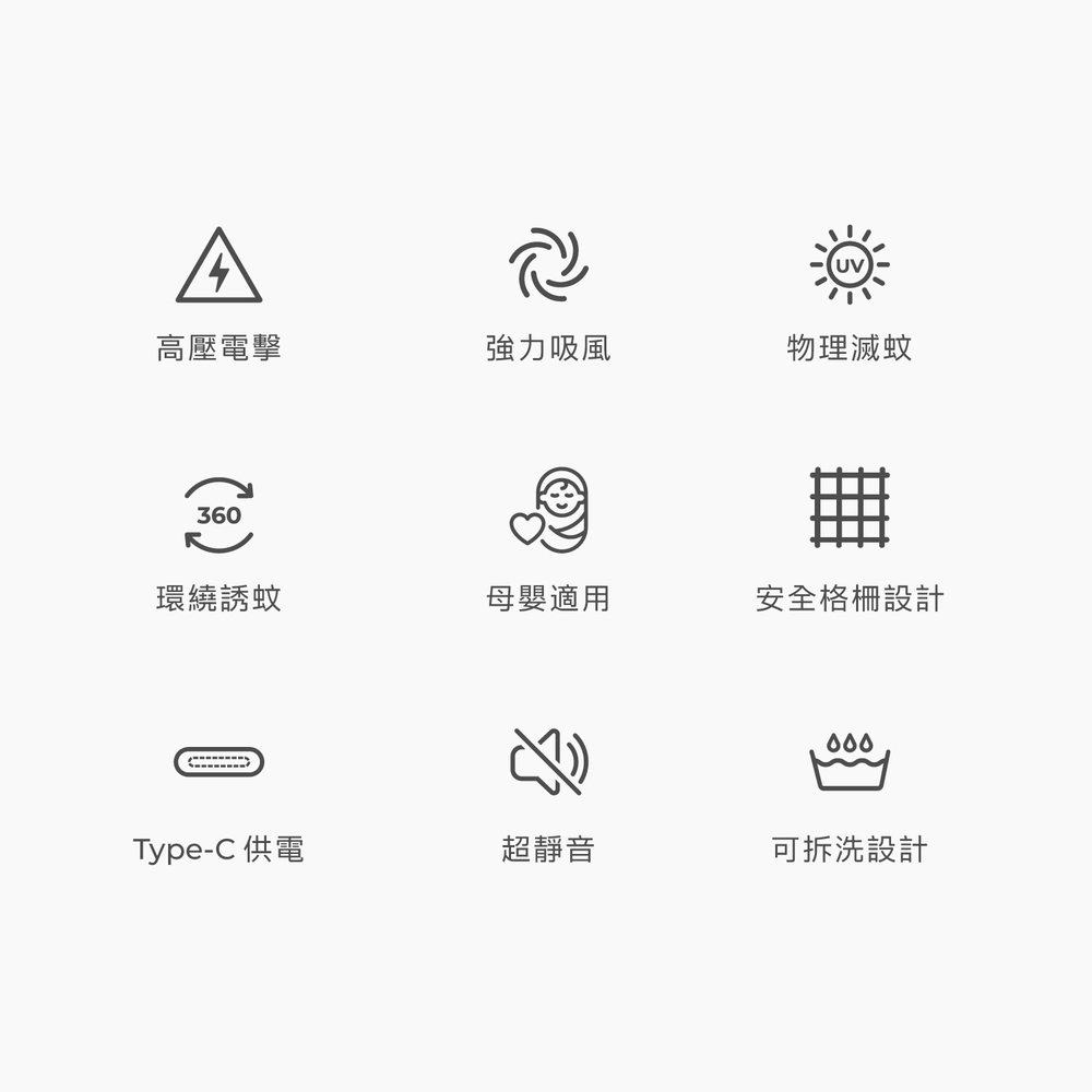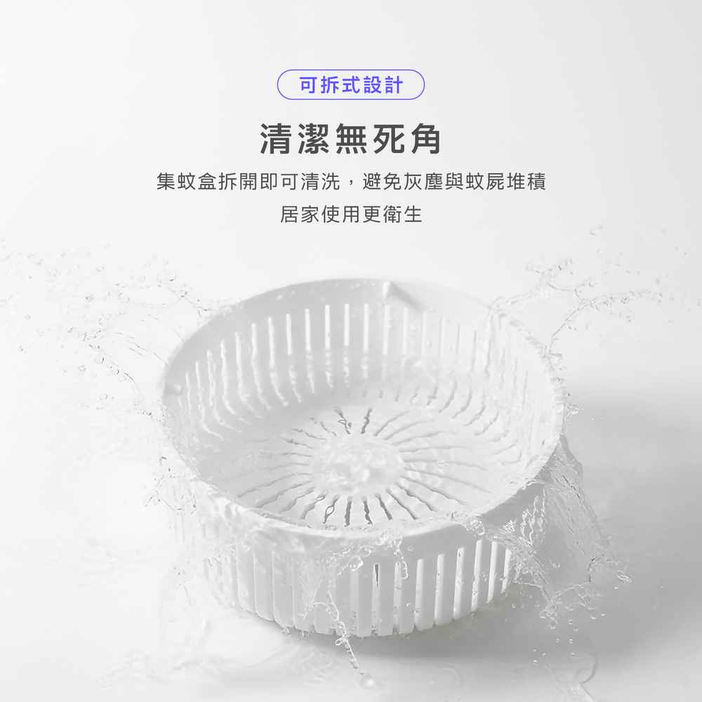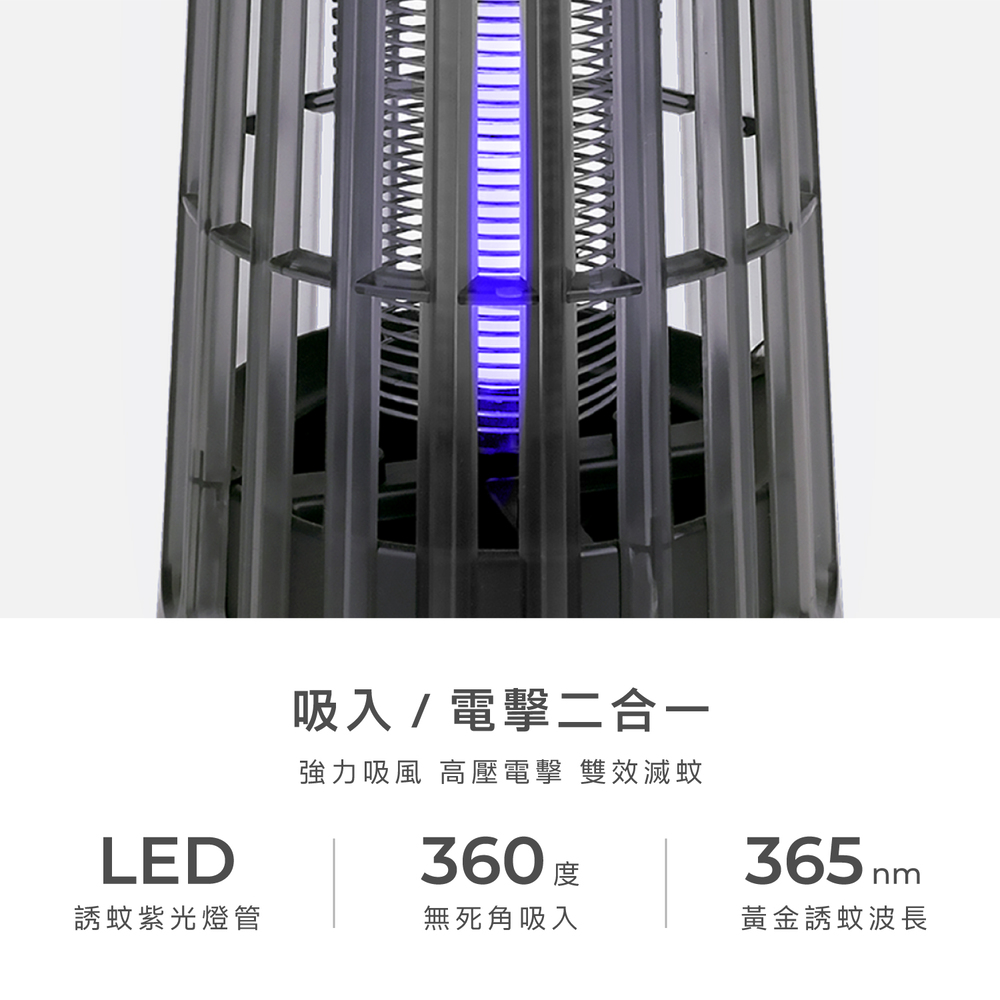 .吸入+電擊 二合一.物理雙效捕蚊,對人體與寵物友善.LED誘蚊紫光燈管,有效誘捕.安全格柵設計,避免誤觸.360度無死角吸入.35dB分貝,安靜捕蚊.Type-C供電.集蚊盒可拆卸清洗
