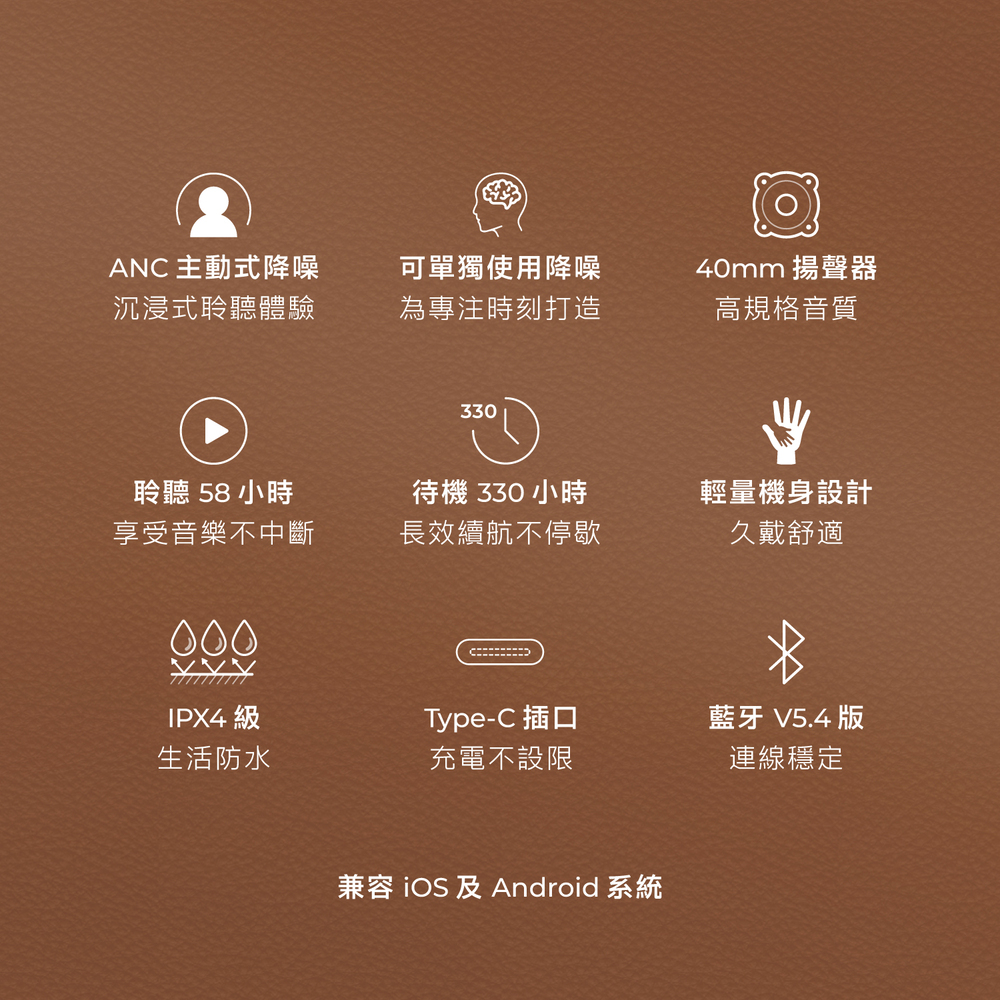 .ANC主動式降噪.40mm 大單元揚聲器,聲場開闊.播放/通話時間約58小時.耳罩可旋轉設計,方便收納.優質仿蛋白橢圓型隔音耳罩.高彈海綿, 觸感順滑細膩舒適.160g機身輕量設計,久戴不累.兼容iOS及Android系統