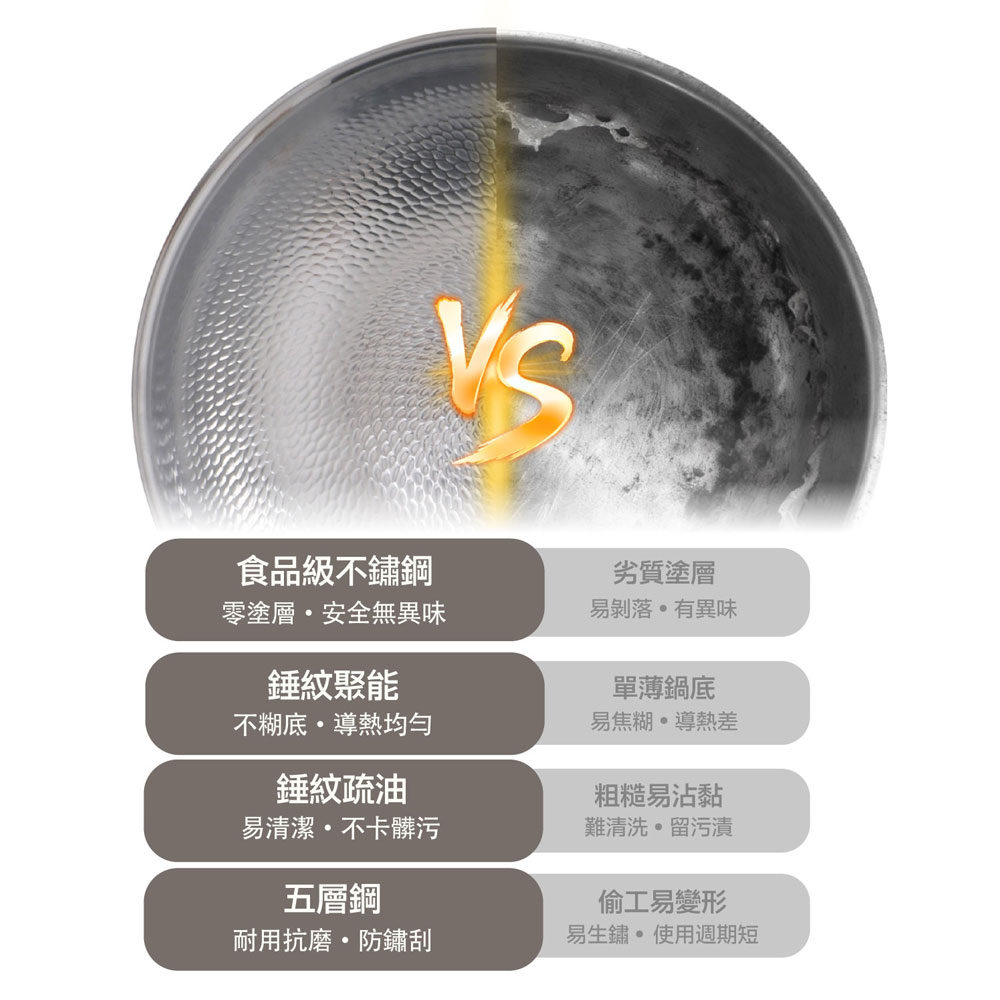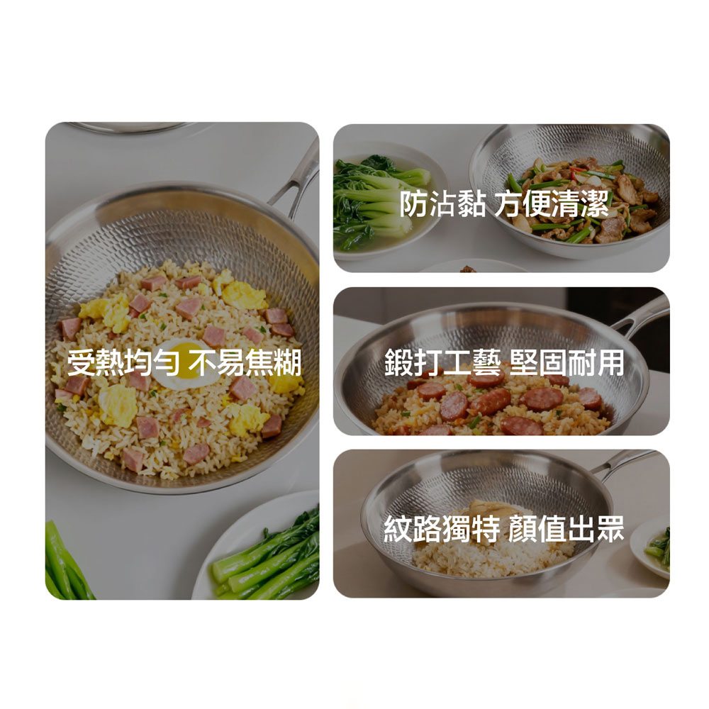 .五層材質,快速烹飪.食品安全,零塗層.不挑爐,美味不受限.食品級安全,316 不鏽鋼.專利錘紋,受熱更均勻.透明烹飪,4mm 高透鋼化玻璃蓋
