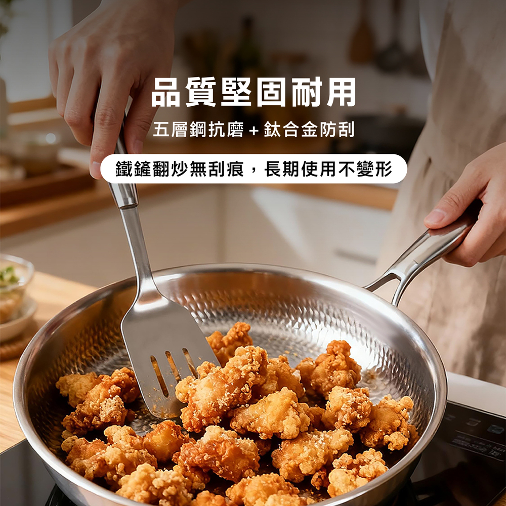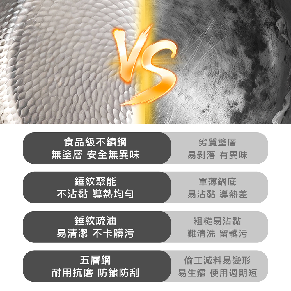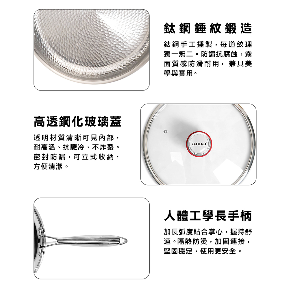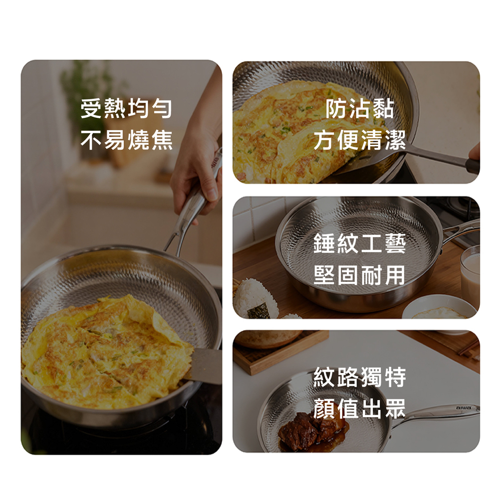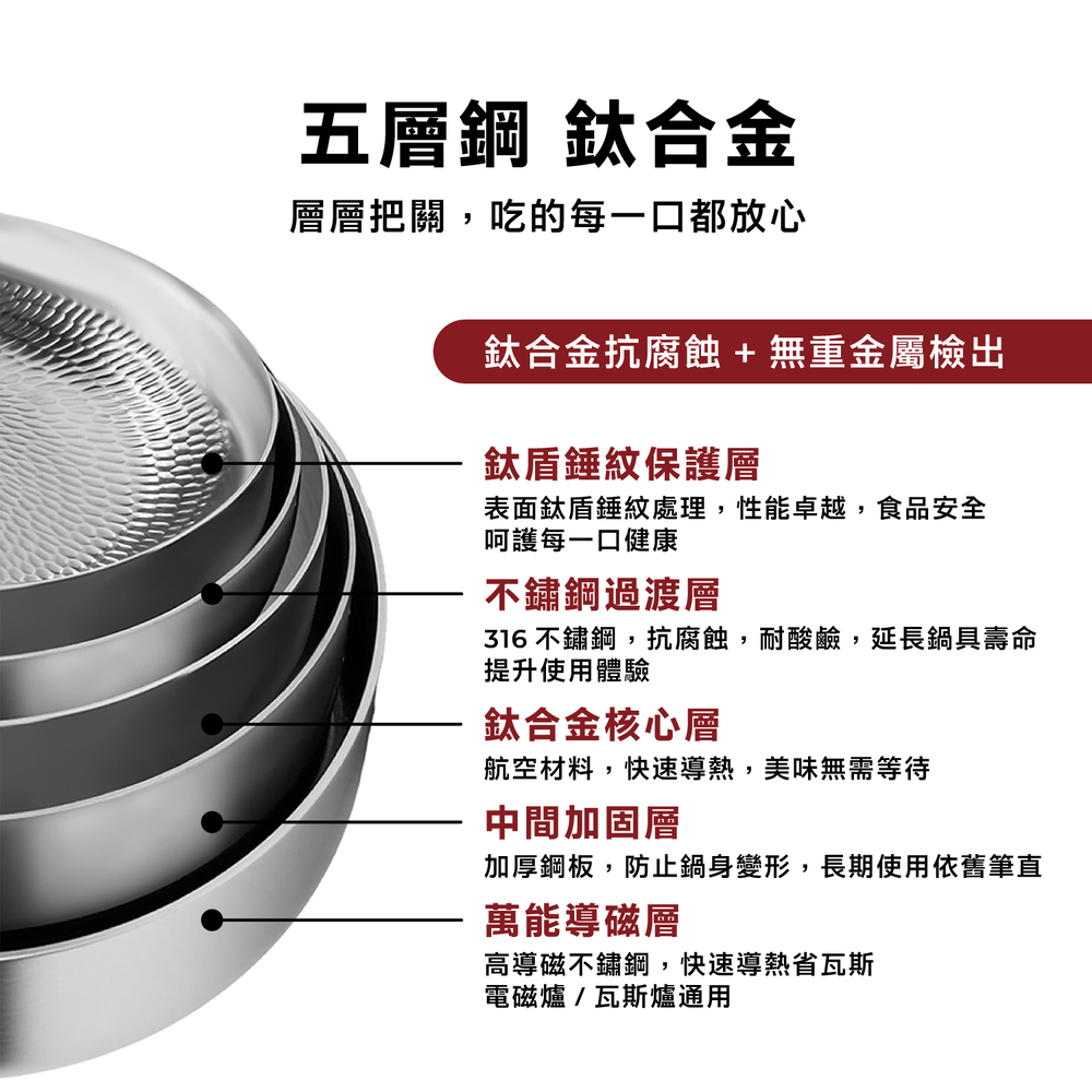 .五層材質,快速烹飪.食品安全,零塗層.不挑爐,美味不受限.專利錘紋,受熱更均勻.食品級安全,316不鏽鋼.透明烹飪,4mm高透鋼化玻璃蓋