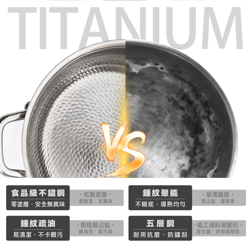 .五層材質,快速烹飪.食品安全,零塗層.不挑爐,美味不受限.專利錘紋,受熱更均勻.食品級安全,316 不鏽鋼.透明烹飪,4mm 高透鋼化玻璃蓋