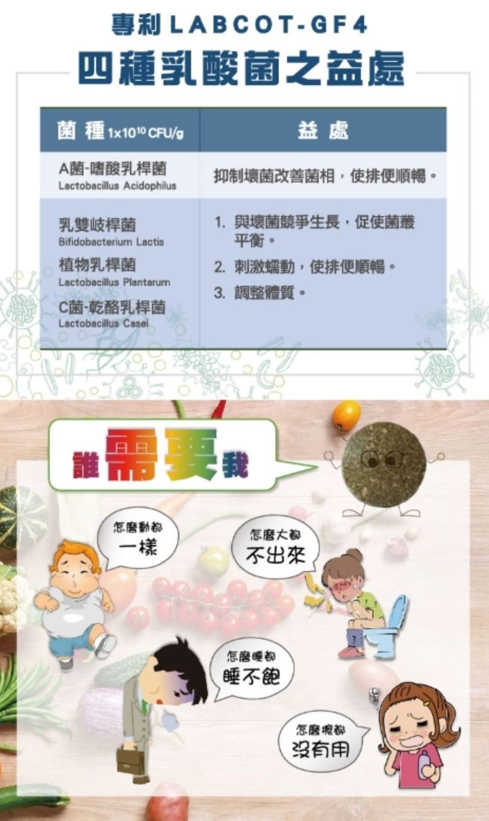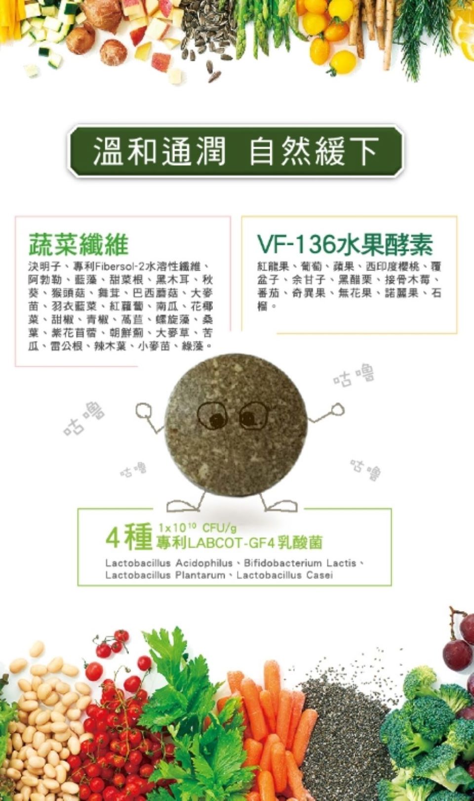 嚴選專利Fibersol-2水溶性纖維(含30種蔬菜水果)、專利VF-136蔬果酵素(含26種酵素)、專利LABCOT-GF4乳酸菌(含4種乳酸菌),溫和通潤,自然緩下,改變細菌叢生態,幫助維持消化道機能。